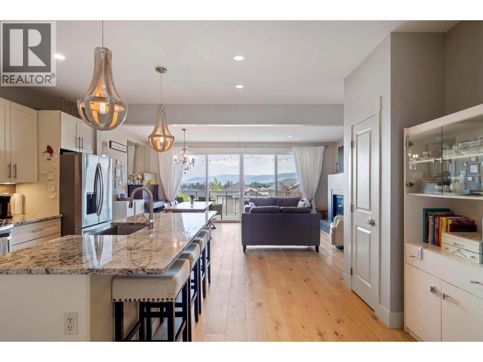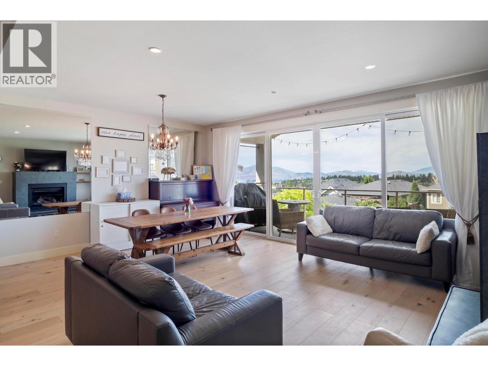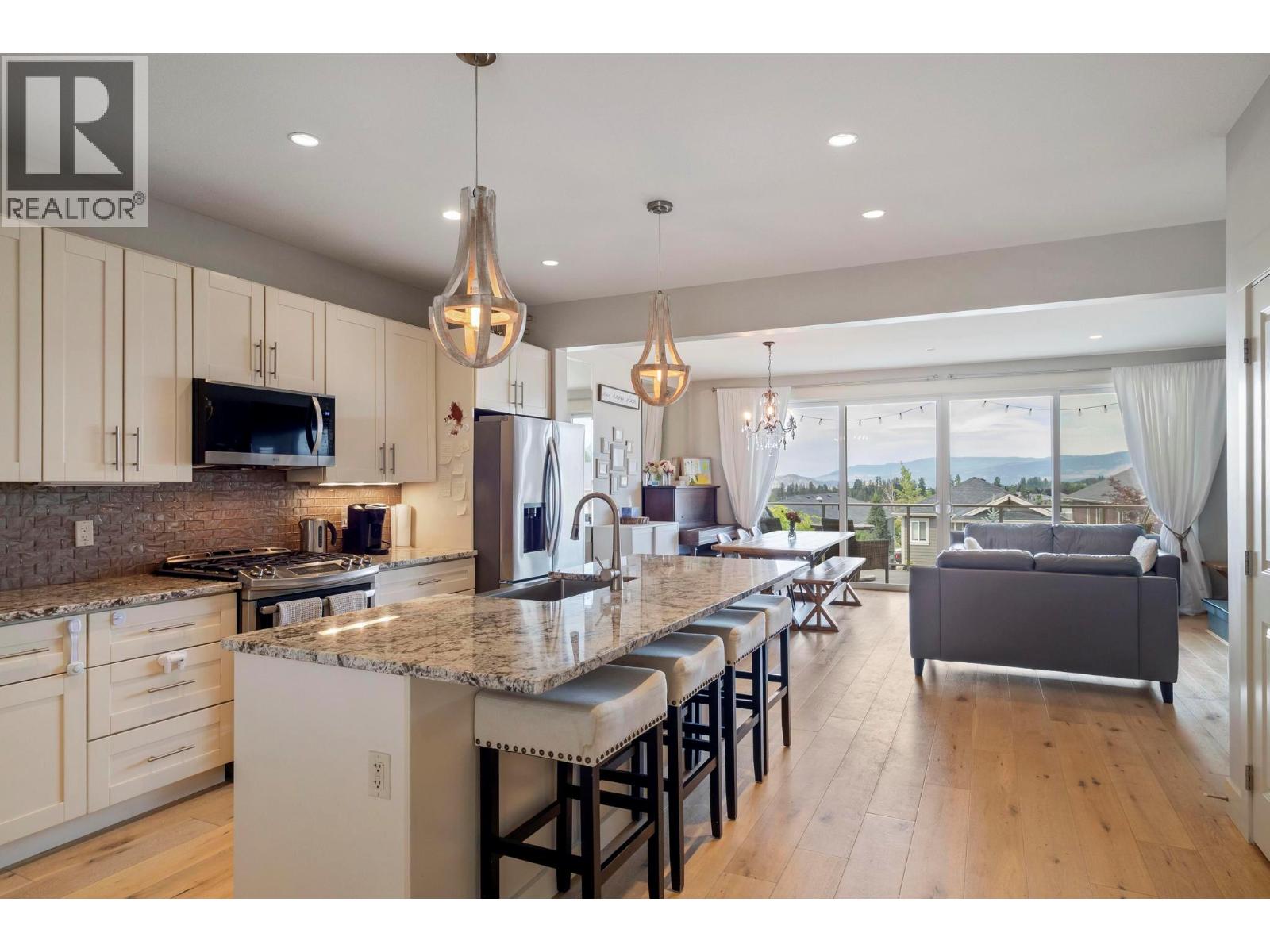 The whole exterior of the house has just been professionally painted! Stop searching, this is the modern family home that you have been looking for! Located in the desirable master-planned community The Ponds in Kelowna's Upper Mission. It's known for its stunning views of Okanagan Lake, city lights, mountains, and surrounding natural beauty. Walk into this bright and spacious 4-bedroom, 4-bathroom + den home with an open concept main floor that flows out on to the covered deck with expansive lake and bridge views. With 9-foot ceilings, a slate gas fireplace, beautiful wide plank white oak hardwood floors, large windows and a huge sliding glass door, this main floor was built to entertain and impress. The renovated kitchen boasts white shaker cabinetry, granite counter tops and stainless-steel appliances. The top floor has a great layout with 3 bedrooms, 2 bathrooms and the laundry all on the same floor. The basement has the potential to become a 1 bed, 1 bath In-law Suite (kitchen plumbing already roughed in) or it can be used as a rec room for young kids. Lots of parking, including a double car garage with a storage room. The recently redone low maintenance yard has automatic irrigation and a fully fenced section to keep the pets and kids safe. This sought-after neighborhood has many amenities close by including the new Upper Mission Shopping Centre, 5 ponds, 2 waterfalls, and 20+ kms of trails plus Canyon Falls Middle School within walking distance. (id:61840)