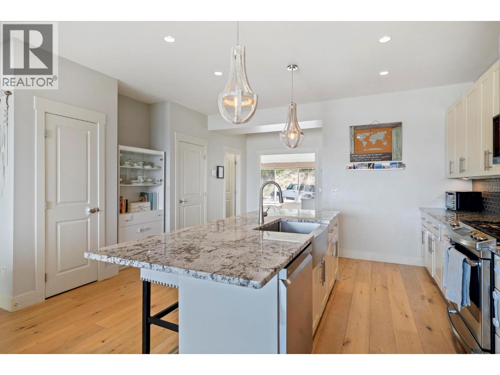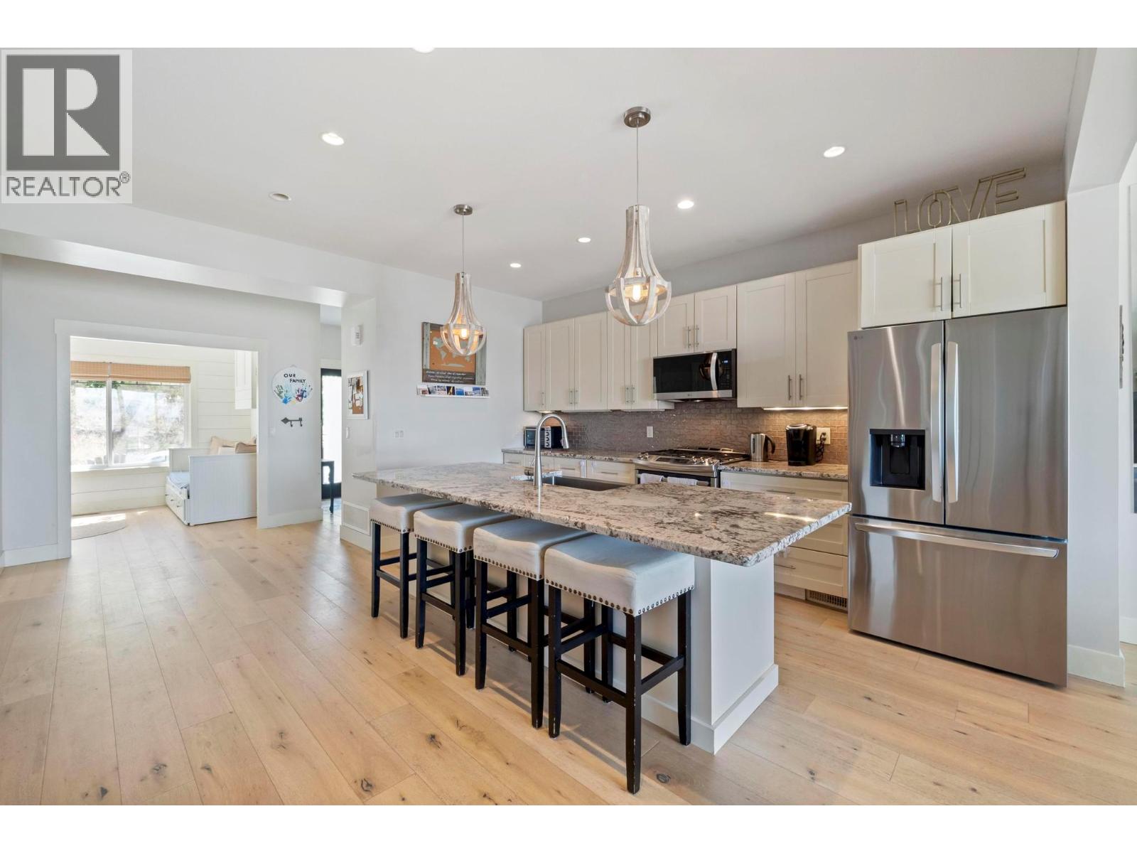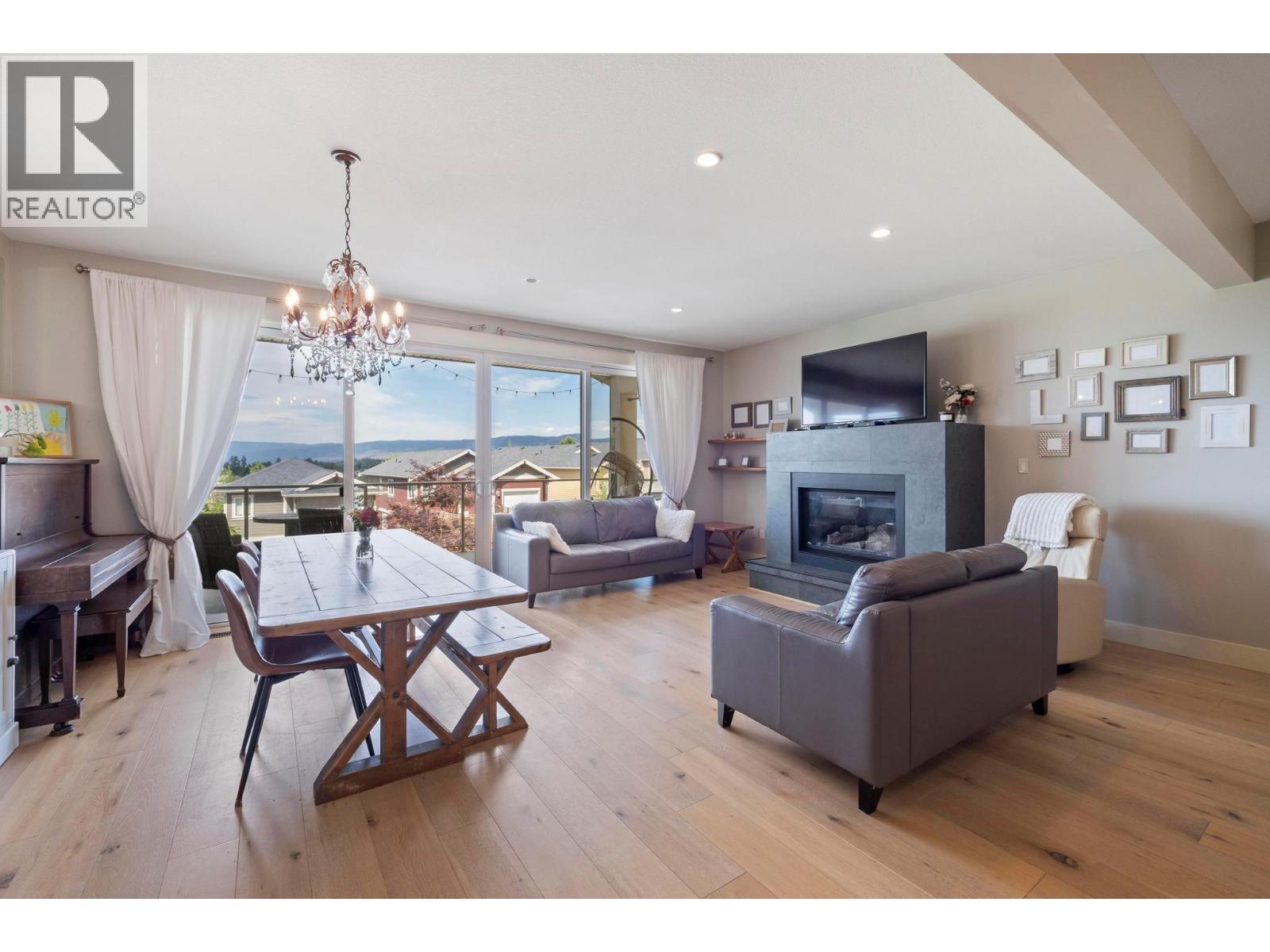 The whole exterior of the house has just been professionally painted! Stop searching, this is the modern family home that you have been looking for! Located in the desirable master-planned community The Ponds in Kelowna's Upper Mission. It's known for its stunning views of Okanagan Lake, city lights, mountains, and surrounding natural beauty. Walk into this bright and spacious 4-bedroom, 4-bathroom + den home with an open concept main floor that flows out on to the covered deck with expansive lake and bridge views. With 9-foot ceilings, a slate gas fireplace, beautiful wide plank white oak hardwood floors, large windows and a huge sliding glass door, this main floor was built to entertain and impress. The renovated kitchen boasts white shaker cabinetry, granite counter tops and stainless-steel appliances. The top floor has a great layout with 3 bedrooms, 2 bathrooms and the laundry all on the same floor. The basement has the potential to become a 1 bed, 1 bath In-law Suite (kitchen plumbing already roughed in) or it can be used as a rec room for young kids. Lots of parking, including a double car garage with a storage room. The recently redone low maintenance yard has automatic irrigation and a fully fenced section to keep the pets and kids safe. This sought-after neighborhood has many amenities close by including the new Upper Mission Shopping Centre, 5 ponds, 2 waterfalls, and 20+ kms of trails plus Canyon Falls Middle School within walking distance. (id:61840)