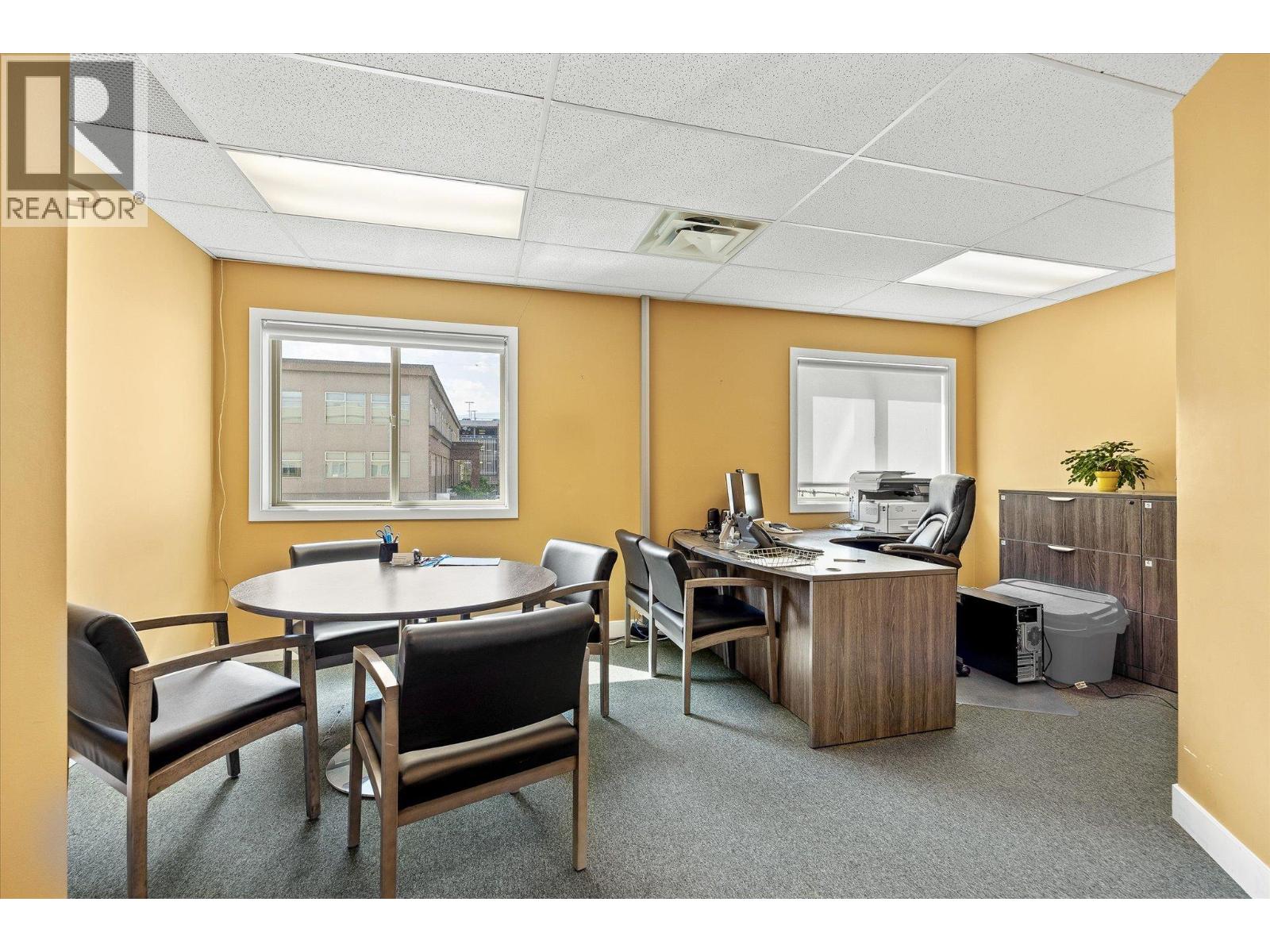 Located on vibrant St. Paul Street between Cawston Avenue and Doyle Avenue, just two blocks east of Water Street, this 2,415 sq. ft. fully tenanted, income generating office space offers an exceptional opportunity to own in the heart of Kelowna’s Cultural District. Completed in 2003, the building features secure entry, full mobility-accessible elevator, and a private parking lot with two entitled stalls plus additional monthly rentals available nearby. Inside, the bright, modern layout includes a large board-room, nine perimeter offices, one large office with two workstations, two oversized offices, and six smaller offices, all with generous windows offering west, north, and east exposure for abundant natural light and fresh air via ventable windows. A spacious boardroom, welcoming reception area, in-suite kitchen, print room, washroom, storage room, and integrated alarm and phone systems provide everything needed for a professional workspace accommodating up to 12 staff. Zoned UC1, this property is ideal for a variety of professional uses. (id:61840)