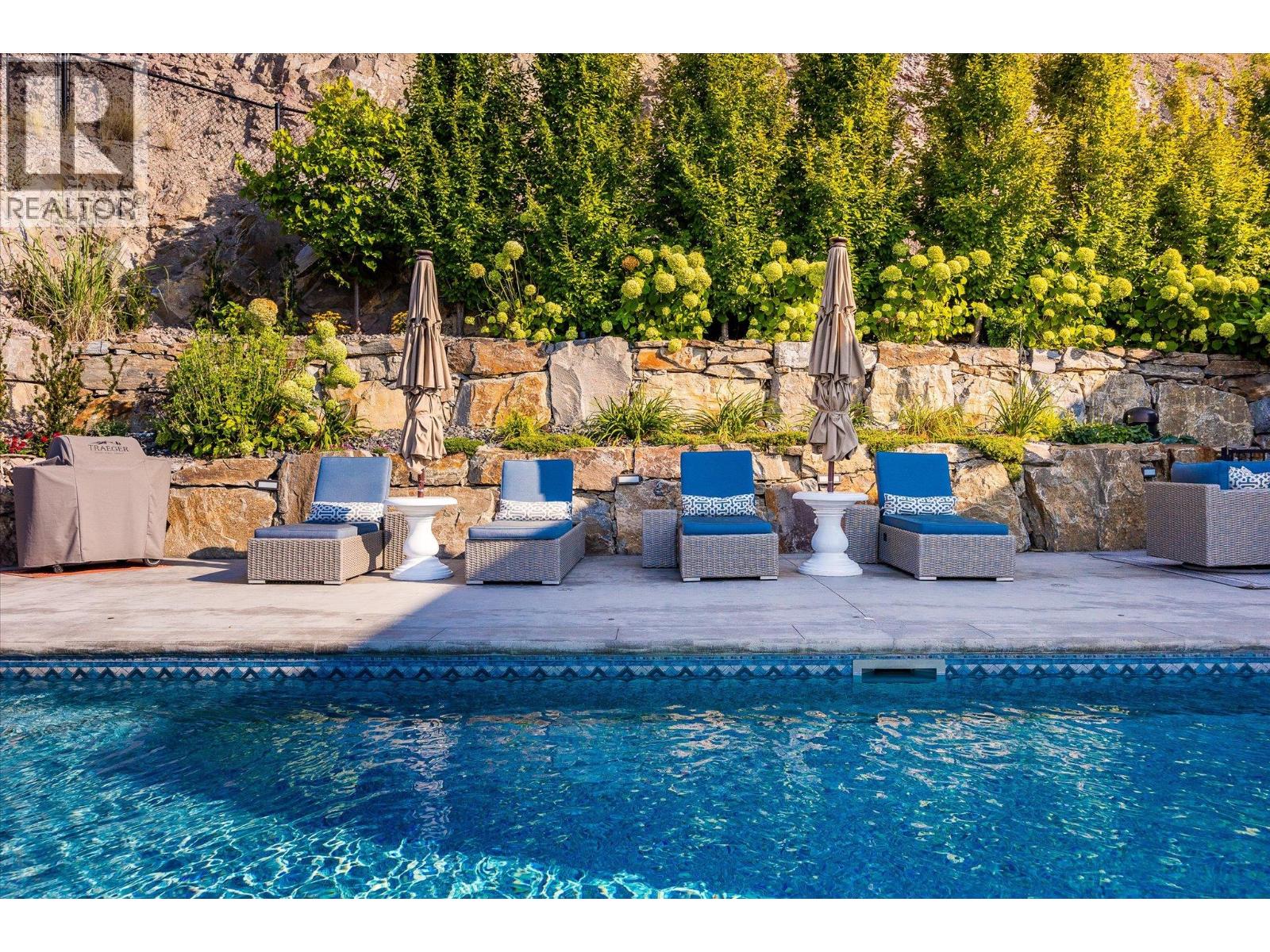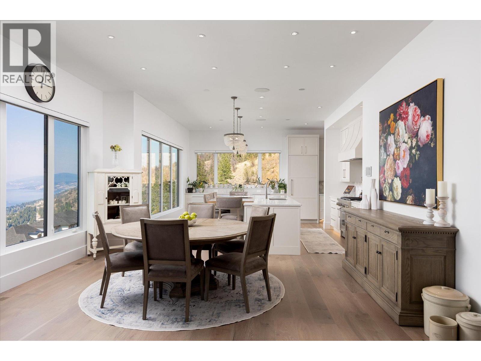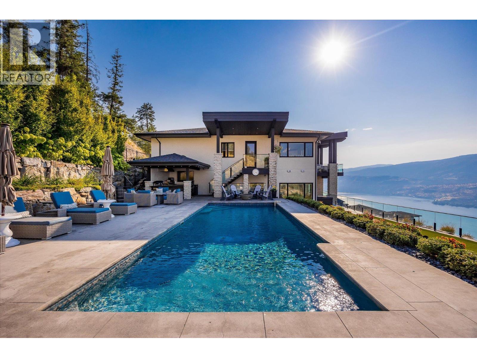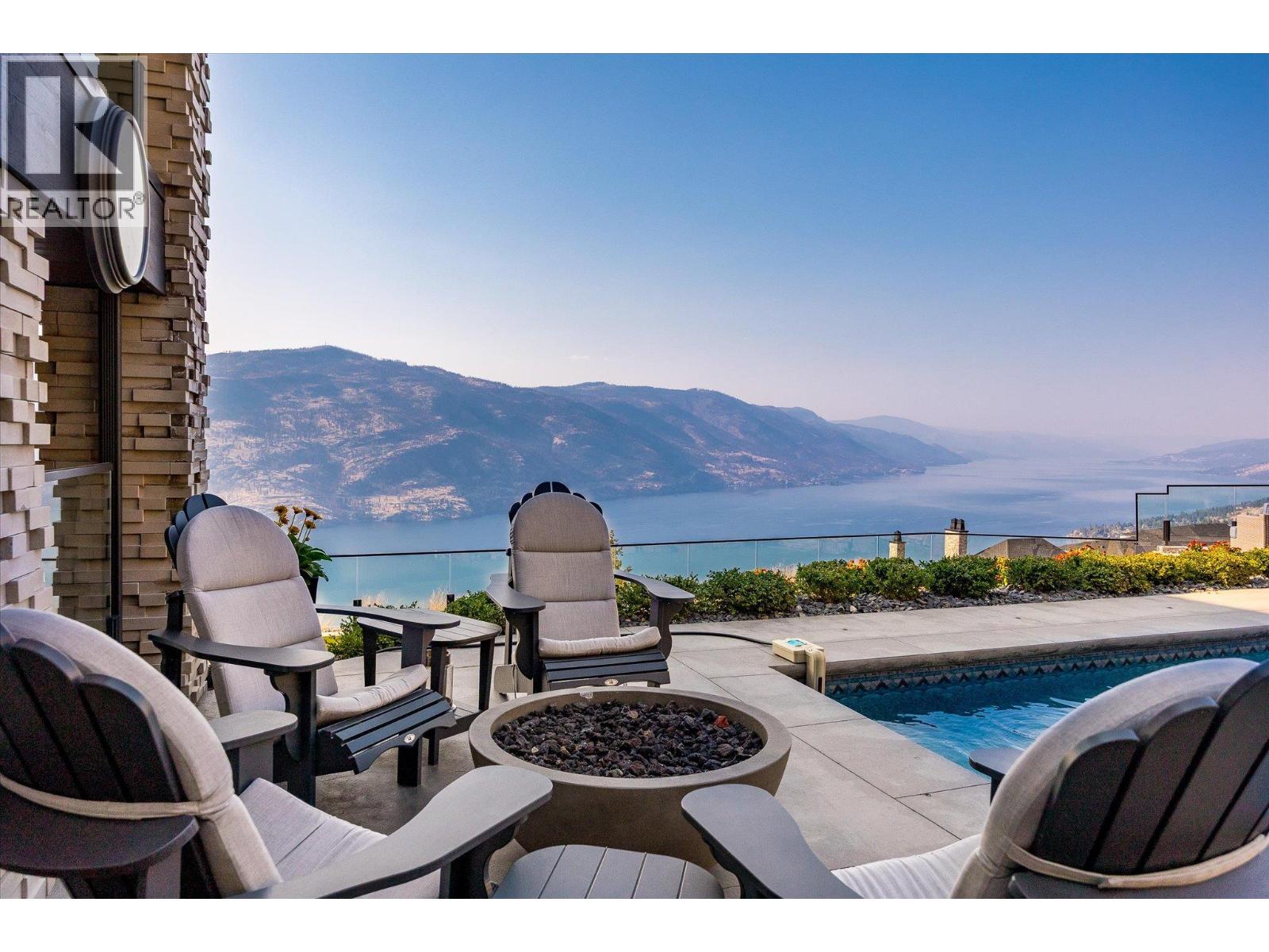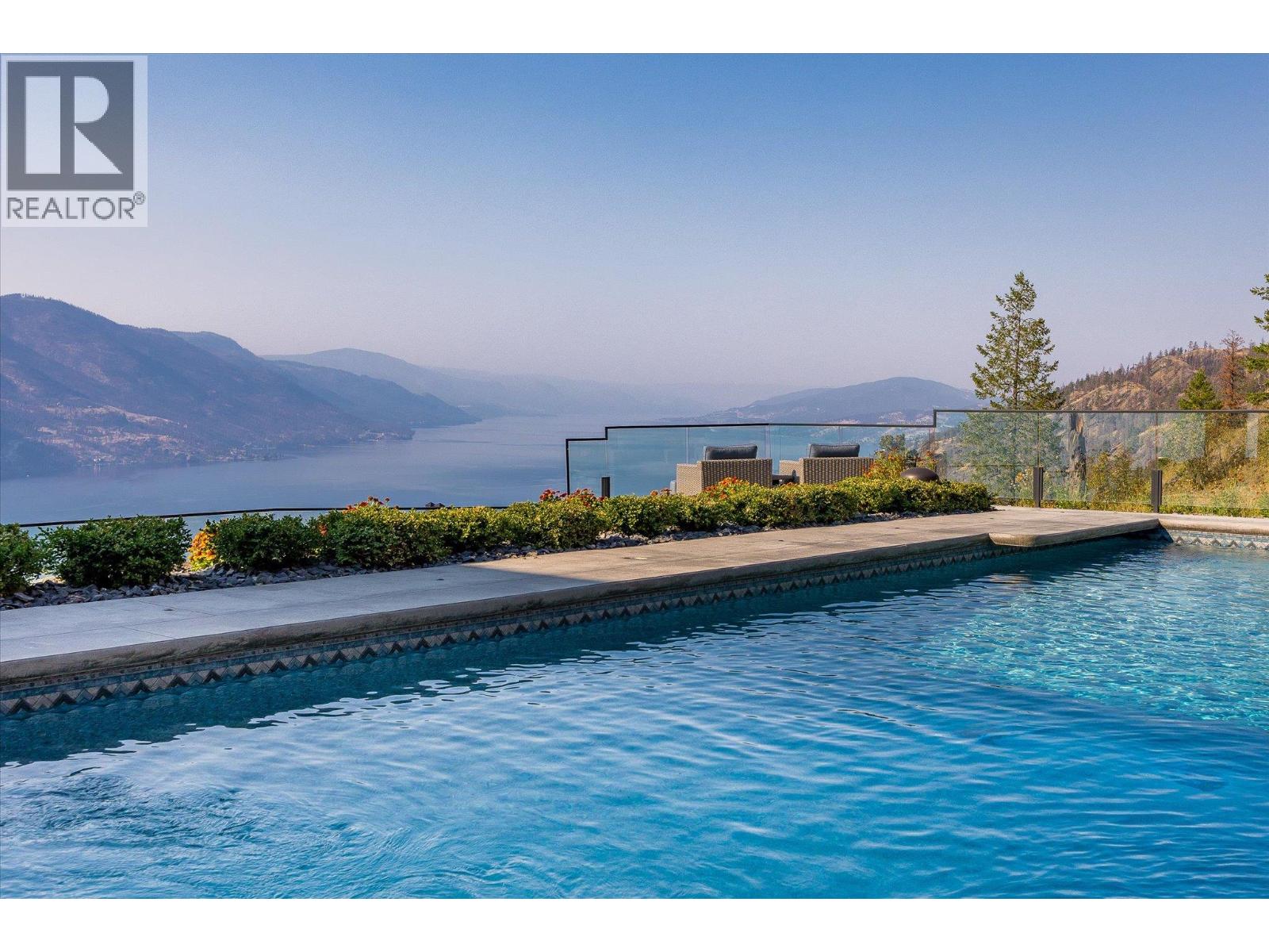 Located in one of Kelowna’s most desirable neighborhoods, this property captures 180-degree panoramic views of the lake and mountains. Set on a quiet cul-de-sac, it offers rare privacy while remaining just minutes from downtown, wineries, golf, restaurants, and all the best of Okanagan living. The open-concept main level seamlessly connects indoor and outdoor living. A chef’s kitchen, designed by Carolyn Walsh, features a Thermador six burner range, two panelled fridges and dishwashers, a panelled freezer along with a striking two-tone island. A new working pantry and custom wine room elevate the home’s entertaining potential. Two primary suites provide private retreats with spectacular lake views. The main-level suite includes a fireplace sitting area and spa-inspired ensuite with a curbless steam shower. The lower-level suite mirrors the same luxury finishes, offering flexibility for guests or family. Designed for entertaining, the lower level also boasts a twelve seat theatre, wet bar, and recreation space, with a separate entrance for guests. Lower level radiant in-floor heating keeps every space warm and inviting. Resort-style outdoor living awaits with a saltwater pool, pool bath, artificial turf yard, and an outdoor kitchen - ideal for summer gatherings. Combining luxury, functionality, and effortless living, this home also grants direct access to Knox Mountain Park and Kelowna’s outdoor lifestyle. With its privacy and breathtaking views, this property delivers the quintessential Okanagan experience. (id:61840)