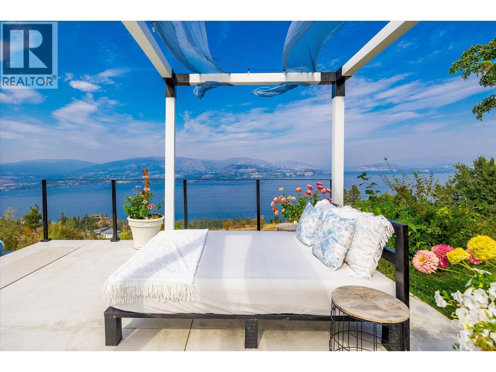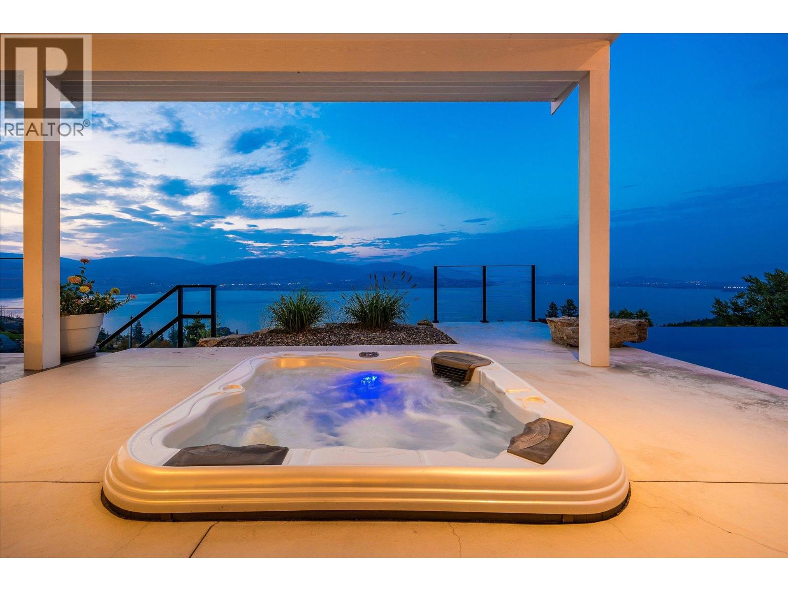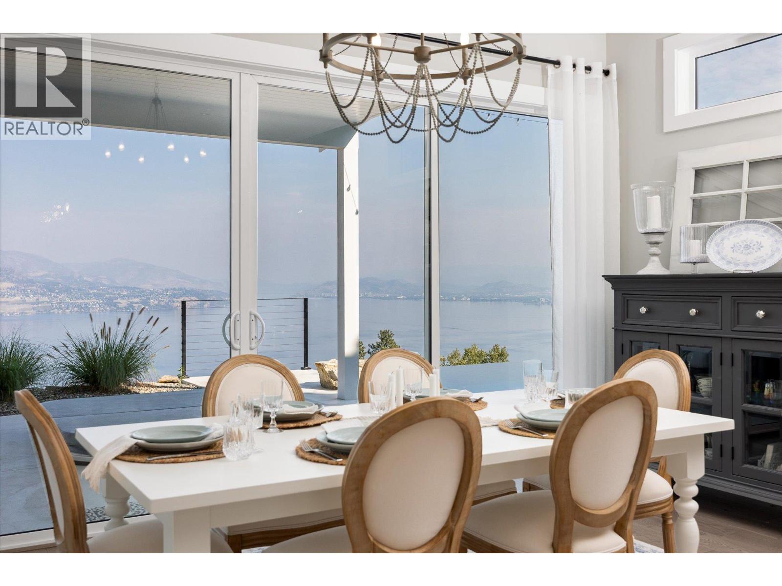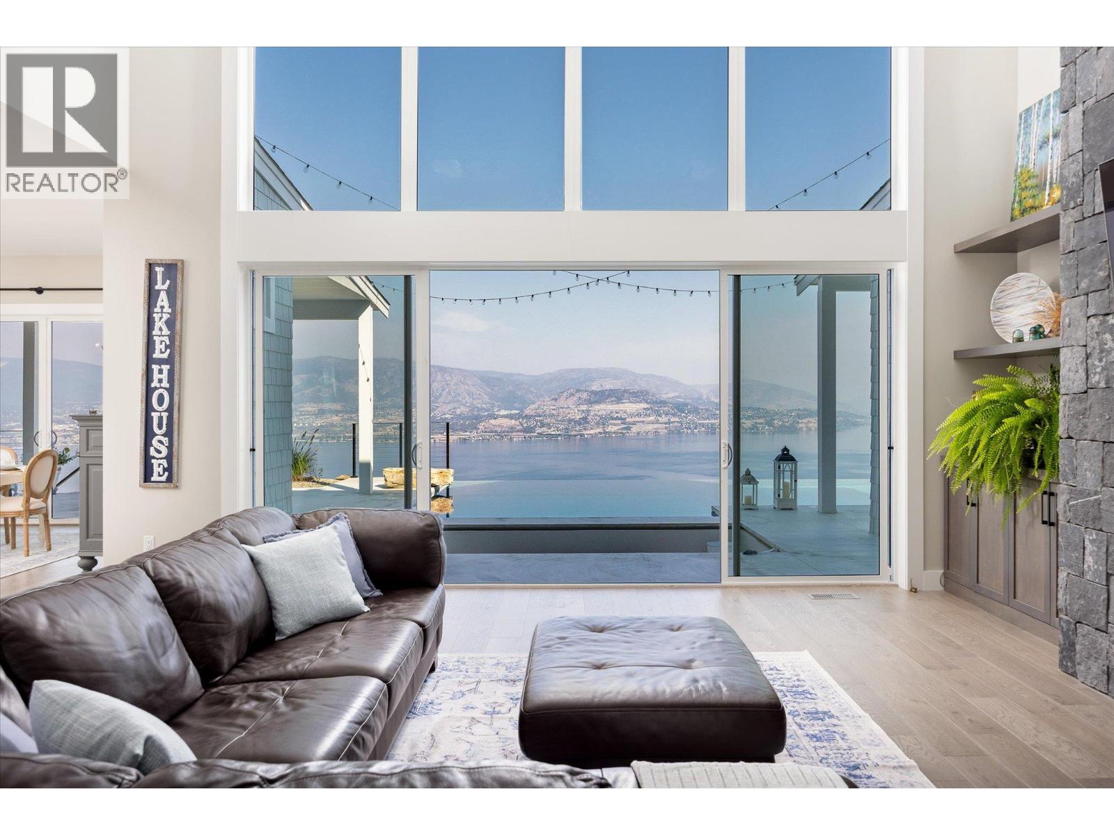 The best view in Kelowna. 2019-built 4 bedroom, 5 bathroom, 5,100+ square foot Modern Hamptons residence perched on a 5.129-acre lot in the Upper Mission area of Kelowna! Upon entering the property, you're greeted with your substantive driveway that carves through the rock, creating a unique estate feel. The grounds include substantial mature landscaping, a custom greenhouse/garden area, a large 30'x60' open-air structure at the top of the property (Wedding venue, workshop conversion, greenhouse, etc), a waterfall & pond feature at your central entry, and several raised planter bed areas; a rare property where even the garden gets a view. Upon entering the home, you are greeted with soaring 20' ceilings in the living room that flow straight ahead to the infinity pool that blends into Okanagan Lake ahead. The main floor offers this stunning living room, a kitchen with a pass-through to the outdoor BBQ area, and a dining room with perfect indoor/outdoor transitions. The master on the main offers the same panoramic views, and a 5-piece private ensuite. The main floor is finished off with a powder room, laundry, and an additional bedroom/office. Upstairs via the floating staircase are two complete master bedrooms with their own en-suites, as well as a private ""perch"" one further level up as a viewpoint. Downstairs, there is a tandem-car garage and a full recreation room that features a bar, room for a pool table, a full bathroom, and a private, fully outfitted theatre room. Outdoor amenities include the covered deck with heaters, BBQ area, hot-tub, tiled infinity pool, and sunken fire pit with seating area. This property uniquely has the modern features of a high-end residence but with 5+ acres, stunning views, full privacy, and extras like the detached structure, and plenty of uncovered parking. (id:61840)