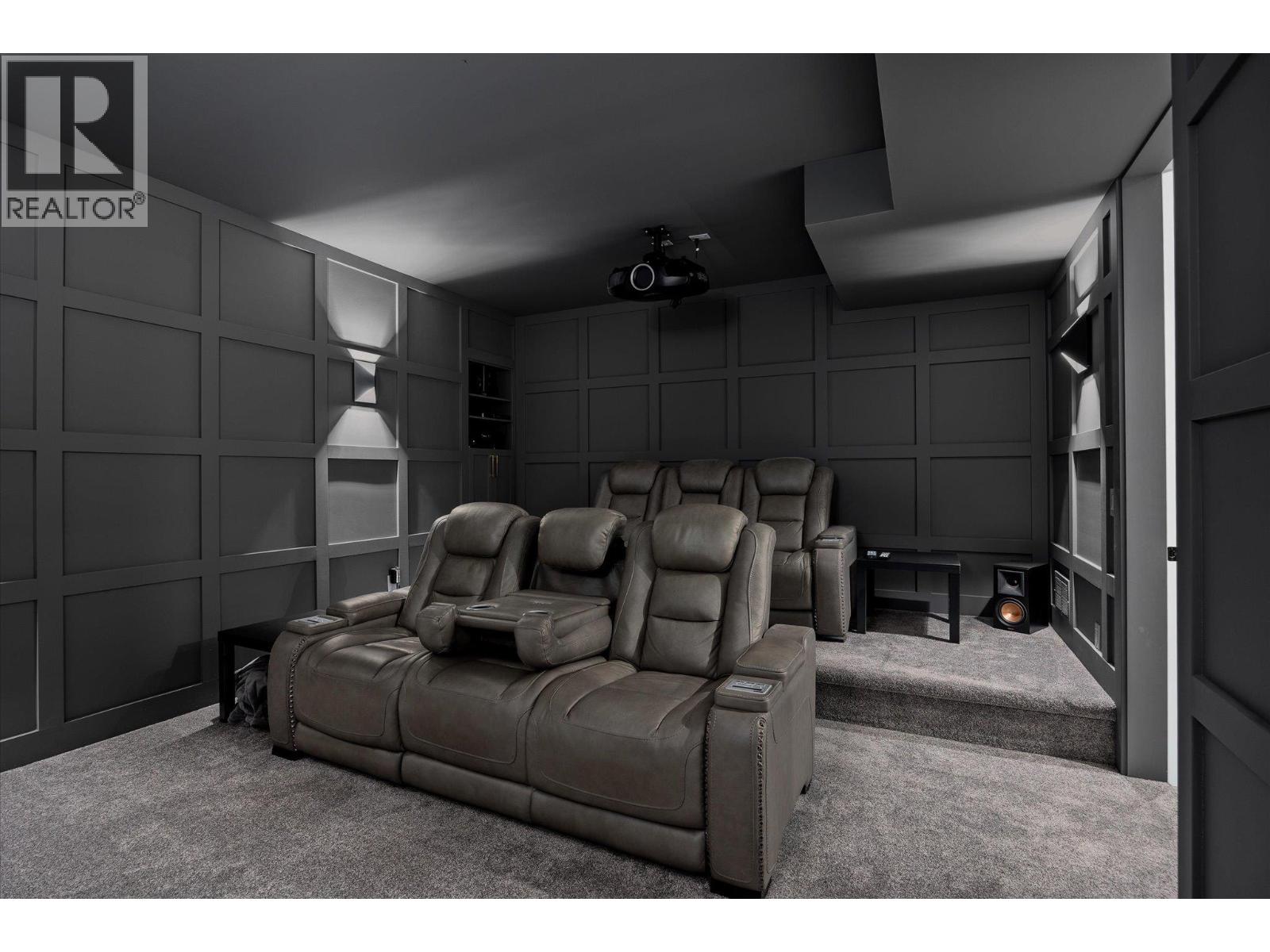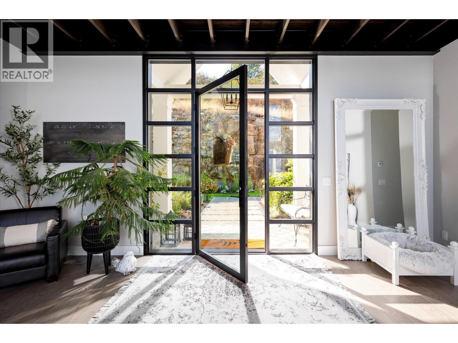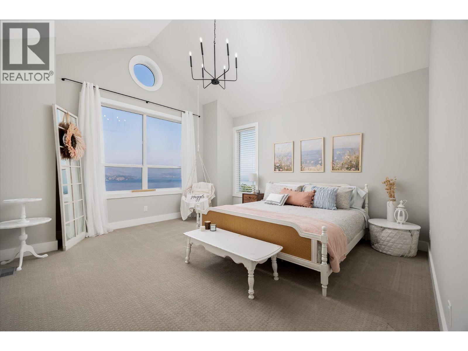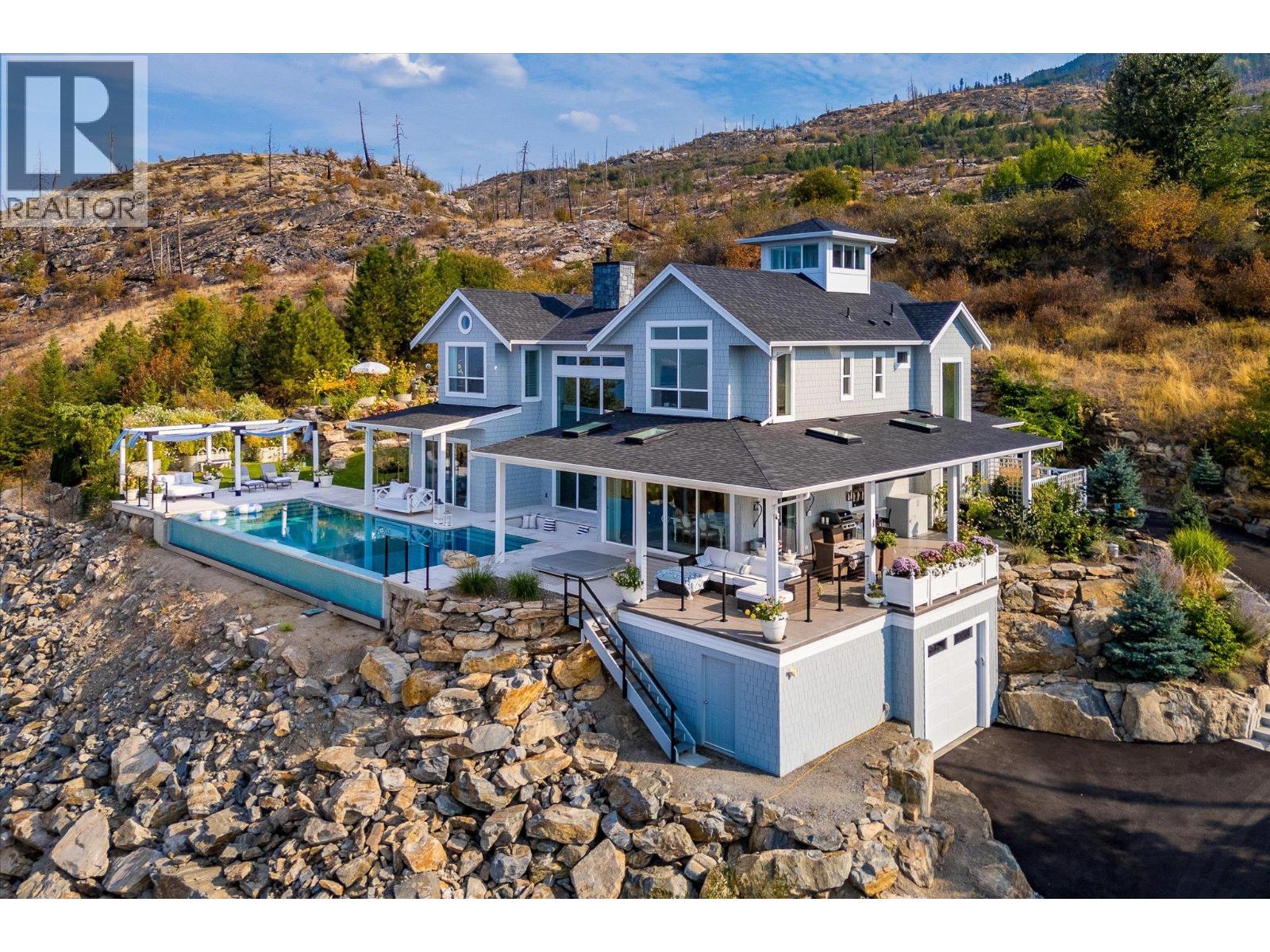 The best view in Kelowna. 2019-built 4 bedroom, 5 bathroom, 5,100+ square foot Modern Hamptons residence perched on a 5.129-acre lot in the Upper Mission area of Kelowna! Upon entering the property, you're greeted with your substantive driveway that carves through the rock, creating a unique estate feel. The grounds include substantial mature landscaping, a custom greenhouse/garden area, a large 30'x60' open-air structure at the top of the property (Wedding venue, workshop conversion, greenhouse, etc), a waterfall & pond feature at your central entry, and several raised planter bed areas; a rare property where even the garden gets a view. Upon entering the home, you are greeted with soaring 20' ceilings in the living room that flow straight ahead to the infinity pool that blends into Okanagan Lake ahead. The main floor offers this stunning living room, a kitchen with a pass-through to the outdoor BBQ area, and a dining room with perfect indoor/outdoor transitions. The master on the main offers the same panoramic views, and a 5-piece private ensuite. The main floor is finished off with a powder room, laundry, and an additional bedroom/office. Upstairs via the floating staircase are two complete master bedrooms with their own en-suites, as well as a private ""perch"" one further level up as a viewpoint. Downstairs, there is a tandem-car garage and a full recreation room that features a bar, room for a pool table, a full bathroom, and a private, fully outfitted theatre room. Outdoor amenities include the covered deck with heaters, BBQ area, hot-tub, tiled infinity pool, and sunken fire pit with seating area. This property uniquely has the modern features of a high-end residence but with 5+ acres, stunning views, full privacy, and extras like the detached structure, and plenty of uncovered parking. (id:61840)