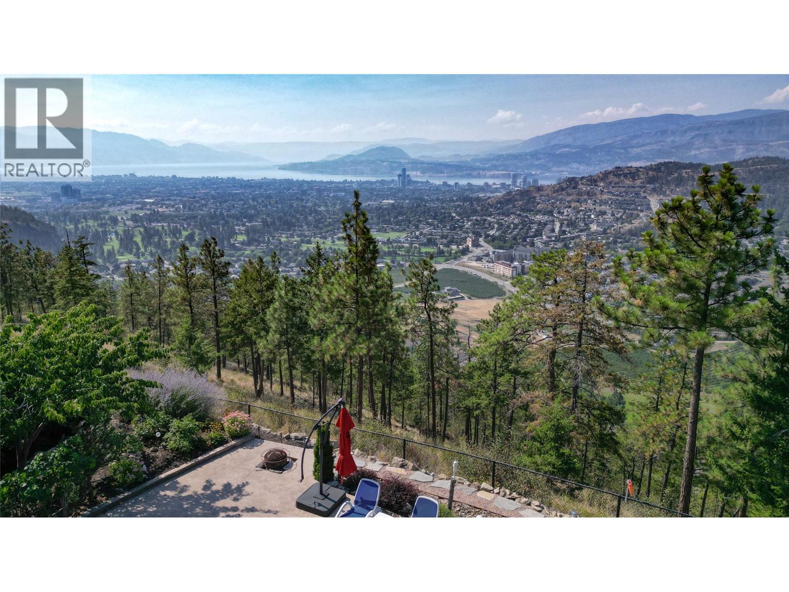 This extraordinary home on Dilworth Mountain is perfectly positioned to capture breathtaking panoramic lake, city, and mountain views. Arrive through the gated, private courtyard, where a tranquil water fountain sets the tone for the elegance within. Designed for both entertaining and everyday comfort, the home seamlessly blends indoor-outdoor living with soaring vaulted ceilings, expansive nano glass doors leading to a large deck, bringing the outdoors in. The gourmet kitchen is appointed with top-of-the-line appliances, granite counters, alder cabinetry, travertine finishes, and a pantry providing additional storage. The great room exudes warmth and relaxation with its floor-to-ceiling fireplace, exposed beams, and rich hardwood floors. Upstairs, the lavish primary suite is a sanctuary unto itself, featuring a lounge area with fireplace and French doors to a deck showing off the spectacular city and lake views. The fully equipped ensuite offers a double shower and stand-alone tub, complemented by an oversized walk-in closet, dressing room, and private laundry. A flex room off the ensuite provides space for an office/nursery and has its own private and shaded deck. The lower level boasts three bedrooms and two bathrooms, along with a cozy living room that flows directly to the pool deck. This level also includes a wet bar, fireplace, and secondary laundry. Outdoors, soak in the stunning views from any of the 5 decks/sitting areas, the sparkling pool, or by the stone fireplace. The yard is framed by lush landscaping and fruit trees, creating a private and peaceful retreat. Completing this exceptional property is a spacious double garage, offering ample room for vehicles and storage. (id:61840)