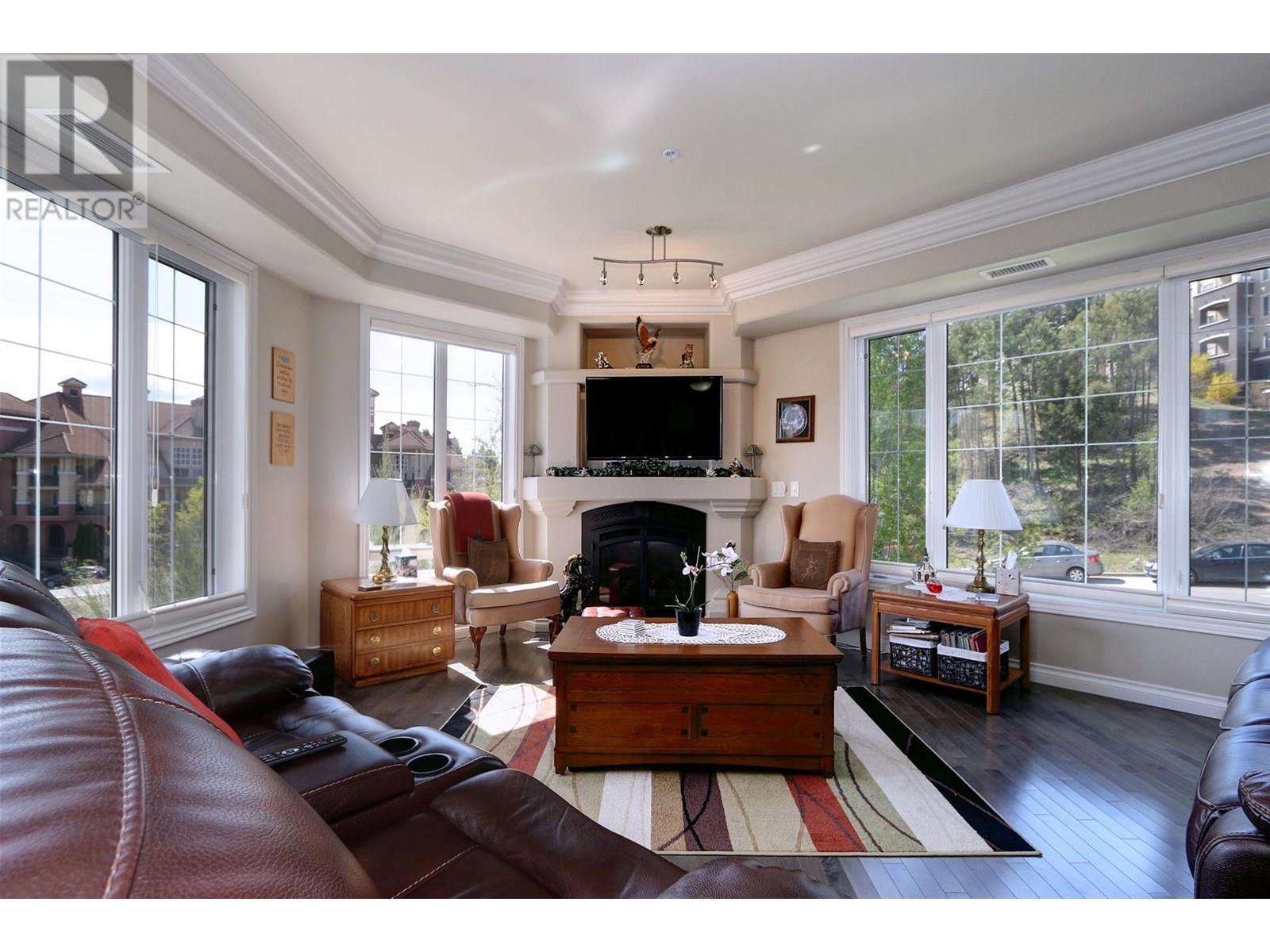 Overlooking the Quail Golf Course this beautifully appointed corner unit condo awaits its new owner. 8 large windows,exquisite tile and hardwood flooring throughout the unit, with coffered ceilings trimmed with double crown moldings and a floor to ceiling custom fireplace. The large bright open floor plan is well laid out and the kitchen a gourmet's delight with granite counters, upgraded stainless appliances and back lit cabinetry. Private/ den office well situated. out of the This is the ultimate getaway for the busy executive or UBCO professor.Just 2 minutes from the airport and a 5 minute walk to the university. This luxury condo was purchased by the past 1st owner as a shell so that he could do a 100% custom build starting from drywall out. The results are a high-end living space where classic quality meets contemporary design. This is a condo like no other in the area. The finish inside is matched by the view outside. This stunning home overlooks the 18th green and waterscape pond. There is a pool with hot tub, wineries close by >Sit on your balcony and look out over the golf course while enjoying your morning coffee or relaxing at the end of the day with a glass of wine. Strata fee include heat,gas, water and hot water. Immediate possesion possible. (id:61840)