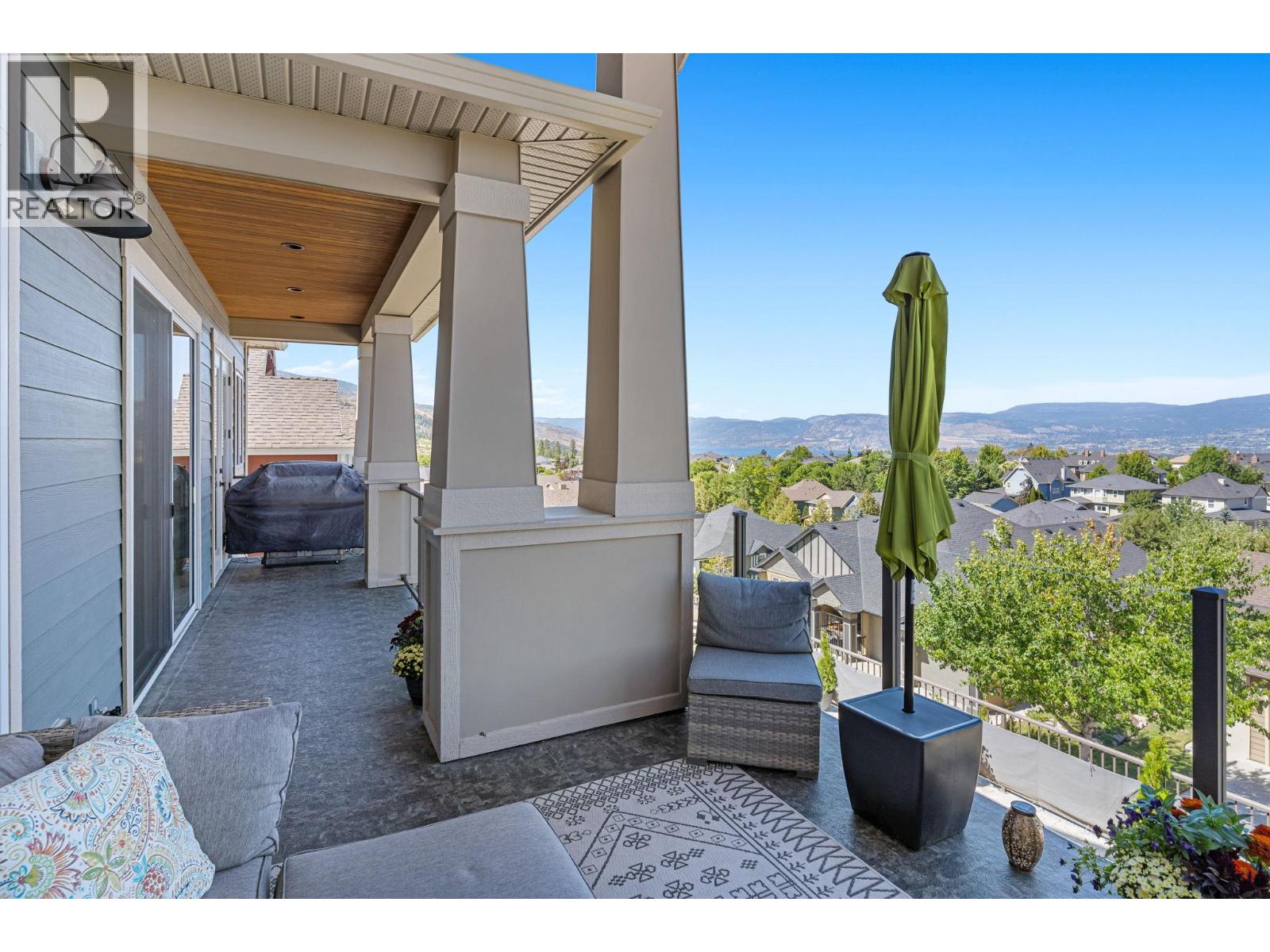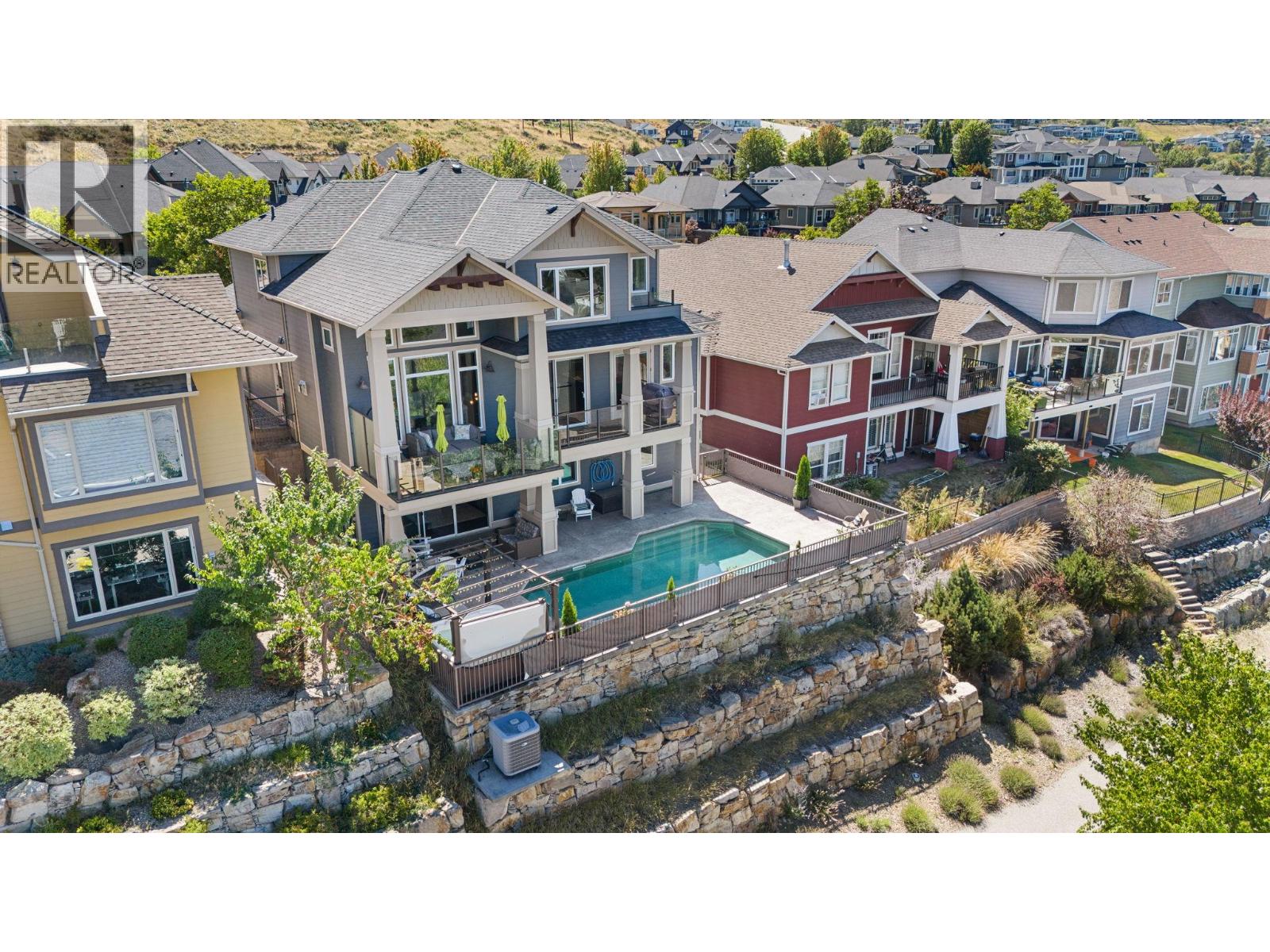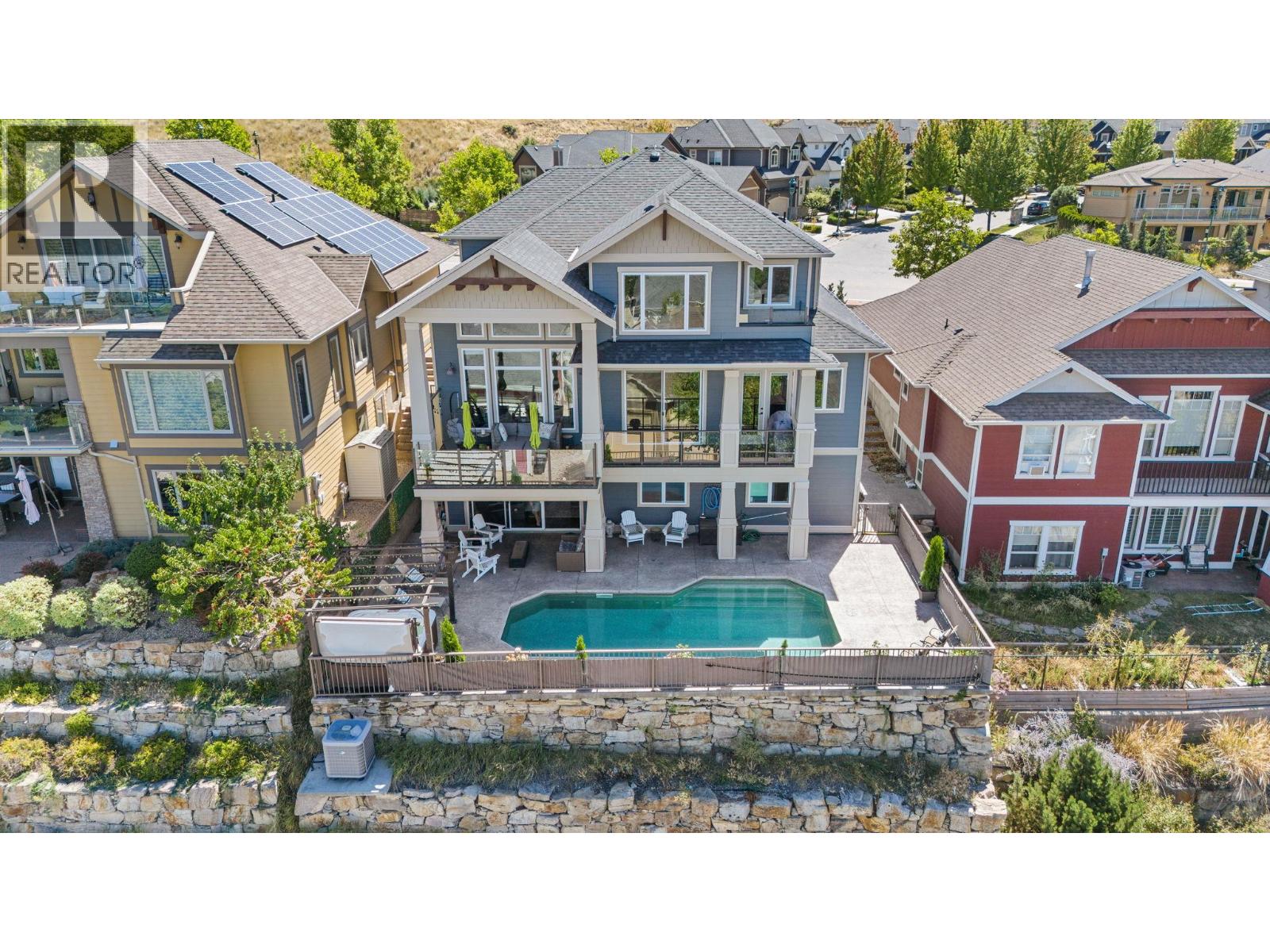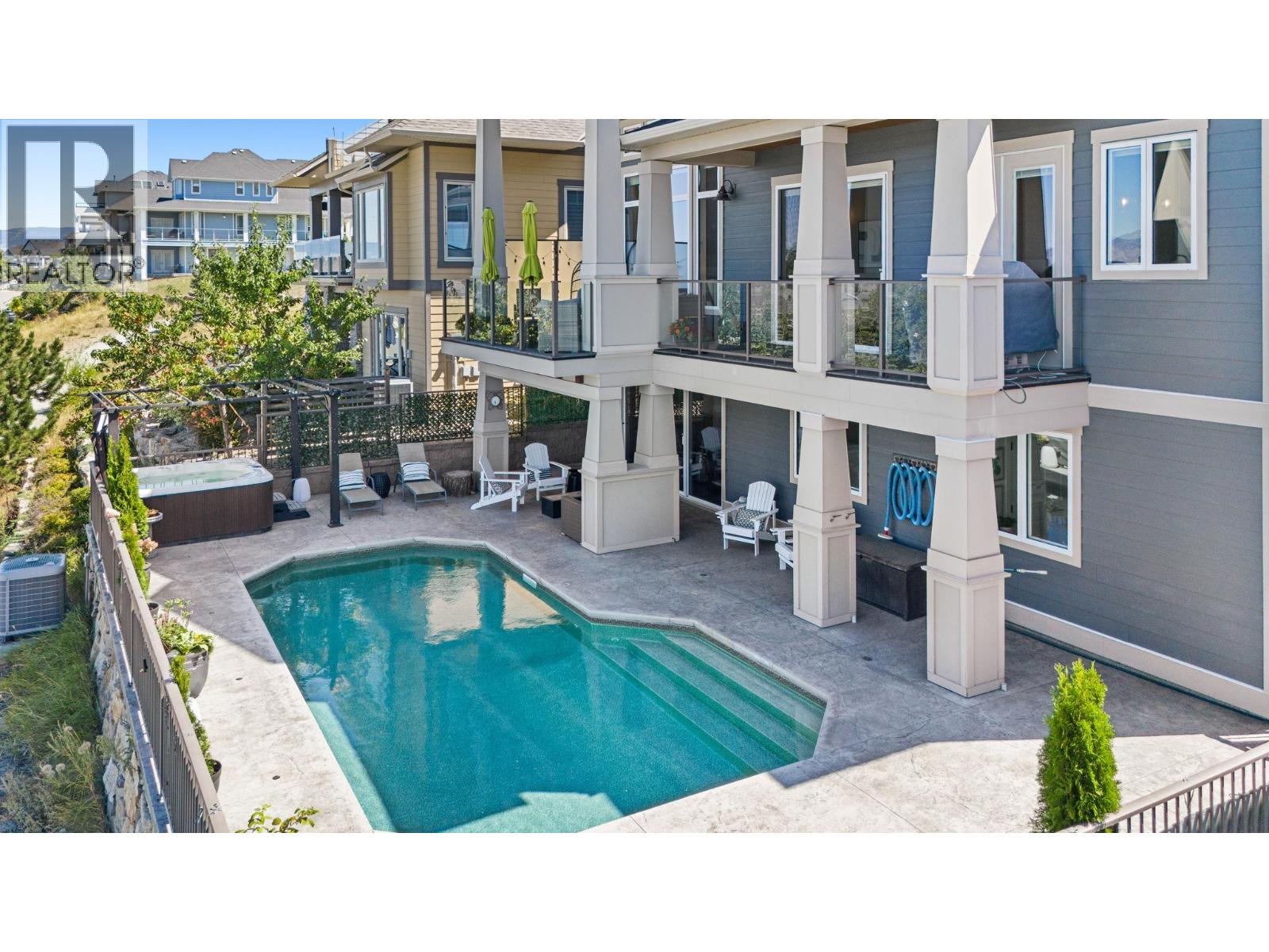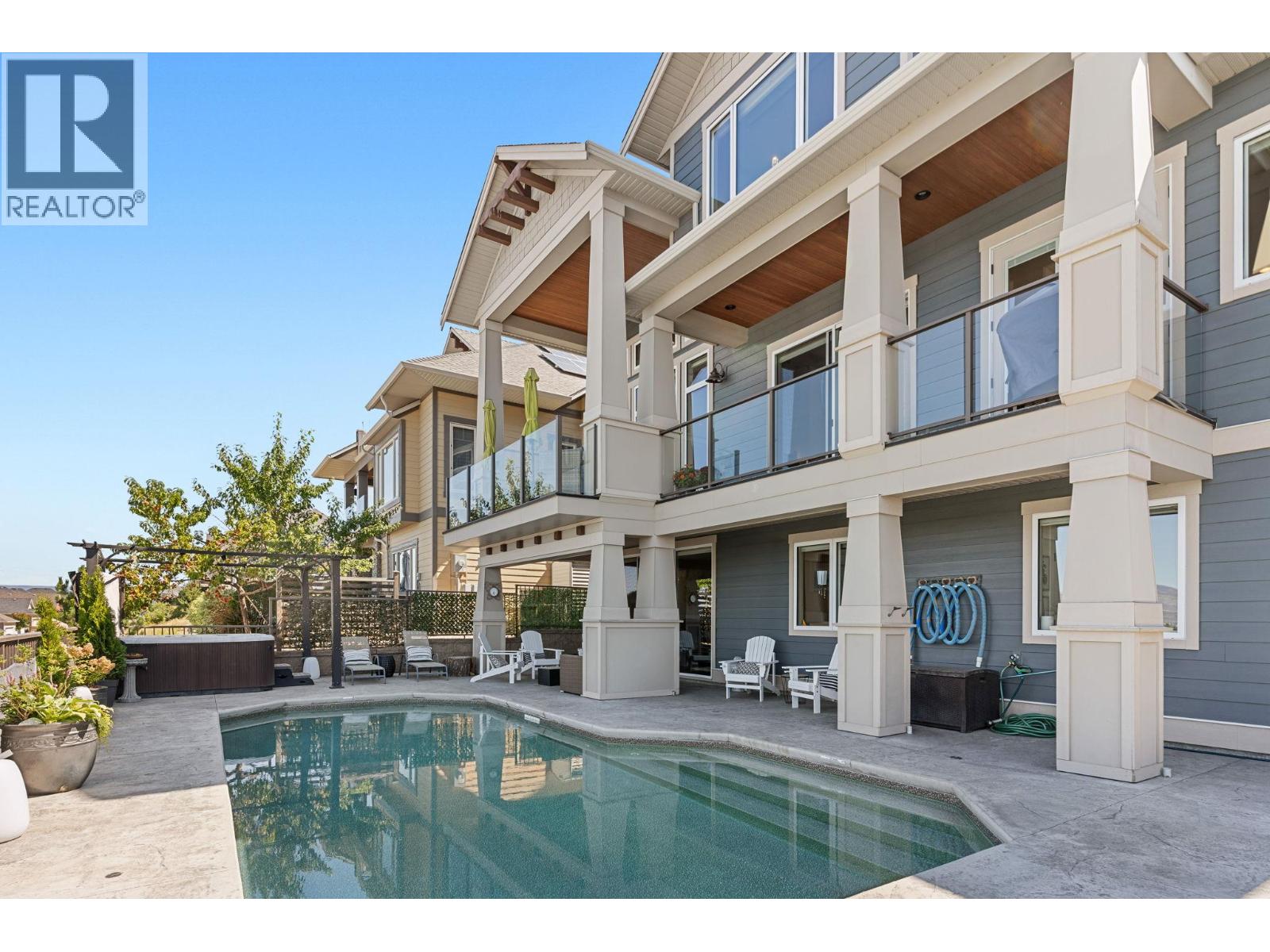 Welcome to this beautiful Kettle Valley two storey walk-out with everything your family could ever want, need or imagine! Gorgeous lake view home with 6 bedrooms, 5.5 baths with hardwood, vaulted ceilings, floor-to-ceiling stone fireplace, gourmet granite island kitchen with b/in stainless appliances, gas cooktop, pot filler and large walk-in pantry. Access to the covered sundeck with great views and gas BBQ hookup (and engineered for a hot tub)! Spacious main floor laundry/mud room with under the counter washer and dryer, b/in bench and lots of storage. Master on the second floor with private lake view deck and spa-like ensuite complete with two-sided fireplace, spacious double vanity, tiled walk-in shower and separate soaker tub and heated tile floors. Second and third bedroom share the jack-and-jill bathroom with dual vanity - perfect for school mornings! Lower level is an entertainers dream with granite wet bar, full-sized fridge and even a draft beer tap with walk-out to the covered patio complete with gas fire pit, gas BBQ hookup and straight to the pool and hot tub deck! Gym under suspended slab too! Cozy front porch to watch the world go by and listen the the bubbling rock water feature. One home away from the linear park that takes you to the children's water park and playground. Transit, hiking trails, Chute Lake Elementary and Kettle Valley Main Street amenities, all within short walking distance. This home is a must see! RV/boat parking in alley at bottom of lot. (id:61840)