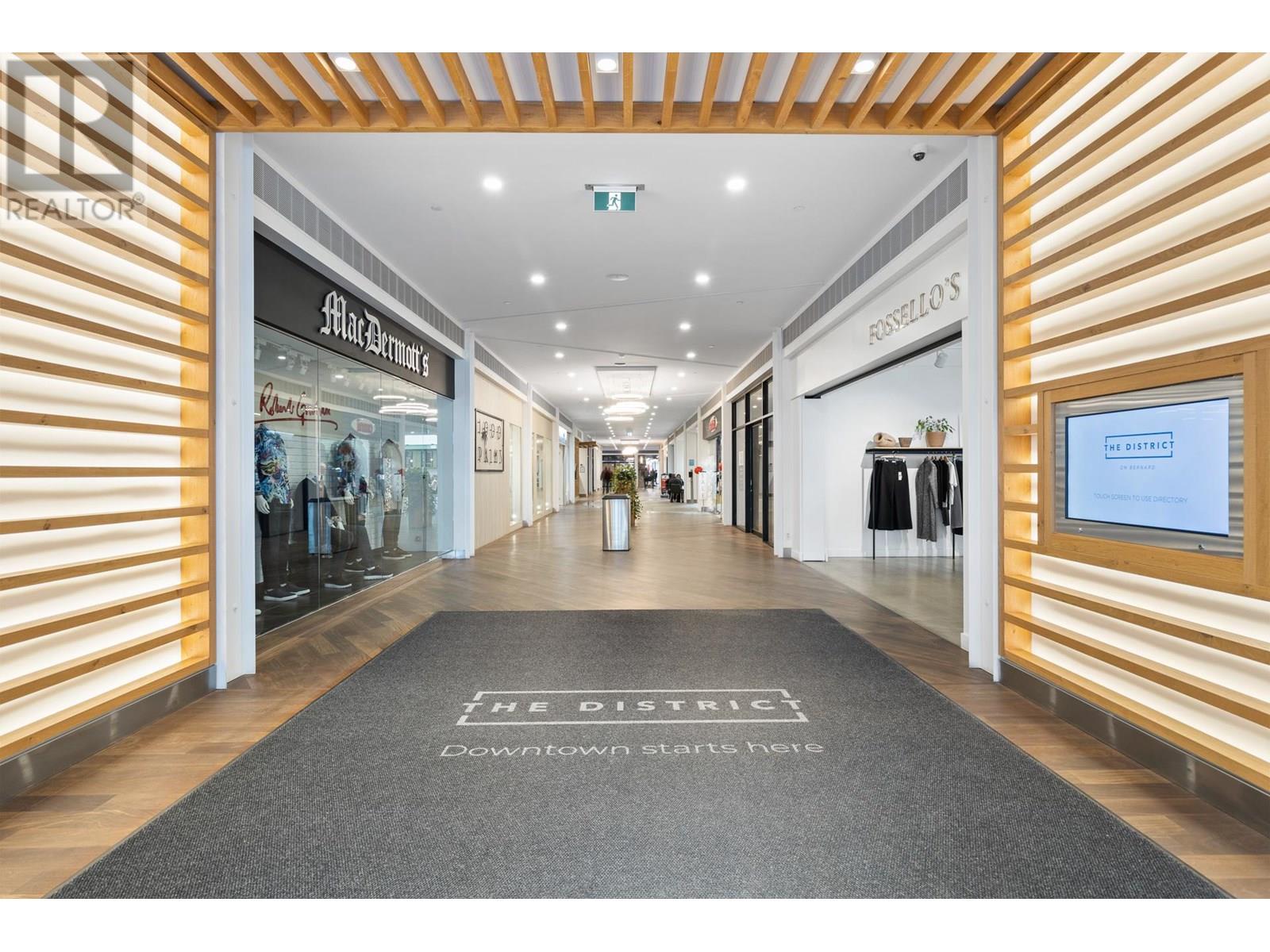 Prime Retail Opportunity – 954 SF in The District on Bernard, Downtown Kelowna Address: 565 Bernard Avenue, Unit 13, Kelowna, BC Position your business at the heart of Kelowna’s vibrant downtown core. This 954 SF retail unit offers an exceptional opportunity...Turnkey Retail Layout: Featuring two stylish fitting rooms and a dedicated rear storage area, this space is designed for operational efficiency and customer comfort...High Exposure Location: Benefit from constant pedestrian and vehicle traffic generated by the dynamic tenant mix within The District and surrounding businesses...Modern, Urban Aesthetic: Clean lines, ample natural light, and contemporary finishes create an inviting retail environment...On-Site Parking: Dedicated customer parking ensures easy accessibility, boosting convenience and sales opportunities... Main Floor Washrooms: Shared facilities provide added customer and staff convenience. Expansion Potential: Flexible Growth Options: Combine with adjacent Unit 14 (1433) to expand your footprint to a total of 2,387 SF — perfect for growing businesses seeking scalability. NNN $13.12 PSF...HVAC + Utilities$3.07 PSF (id:61840)