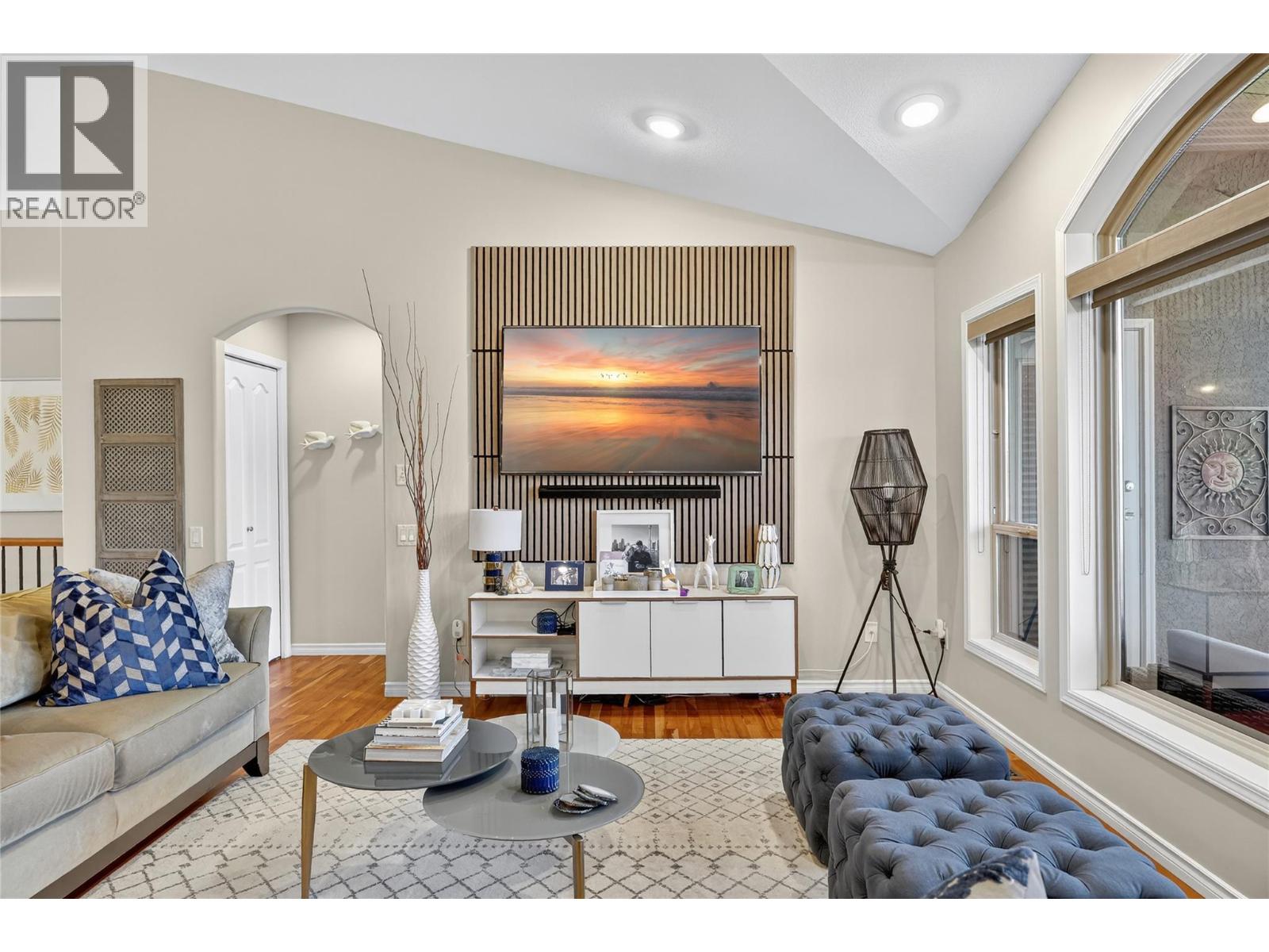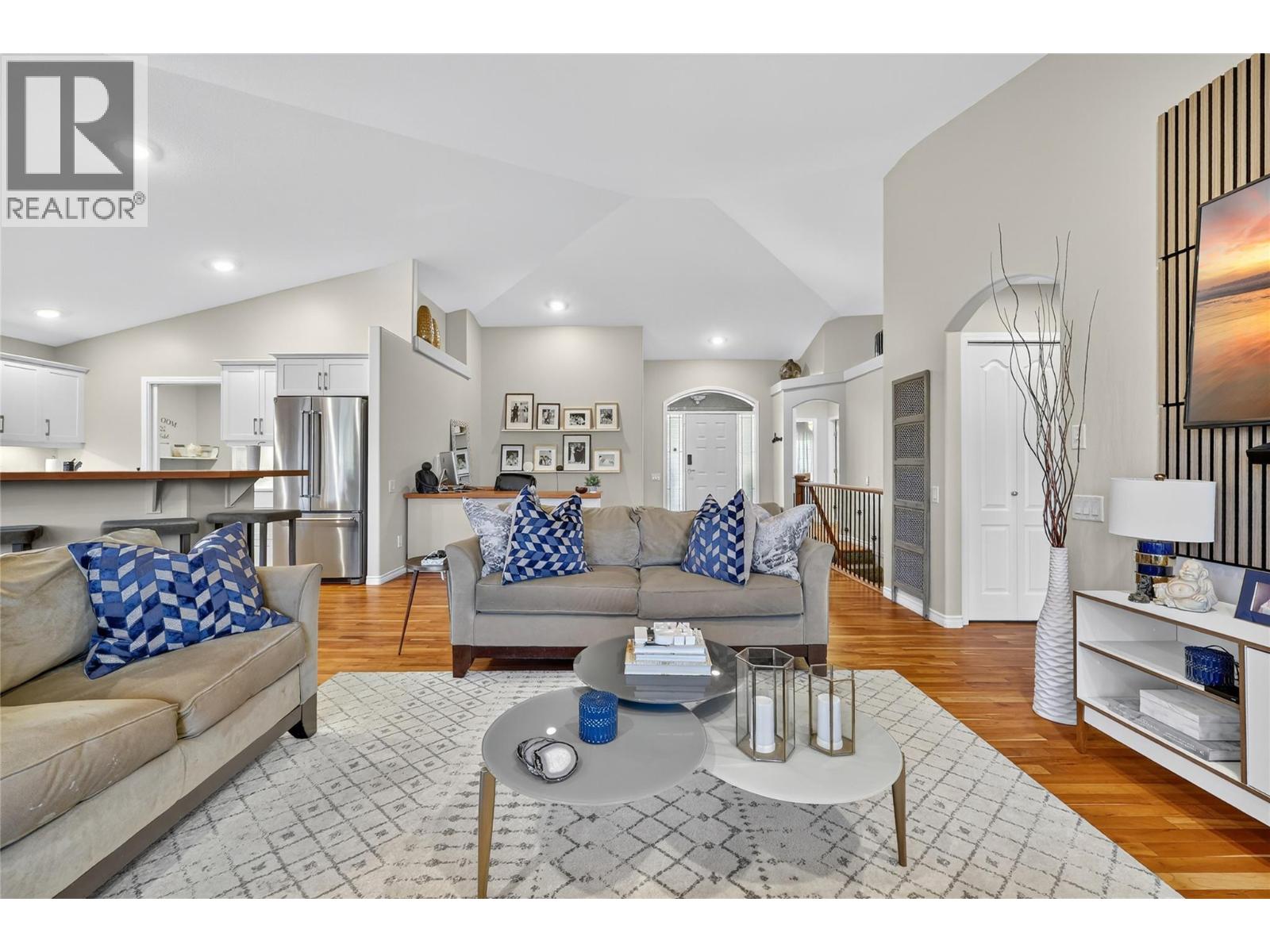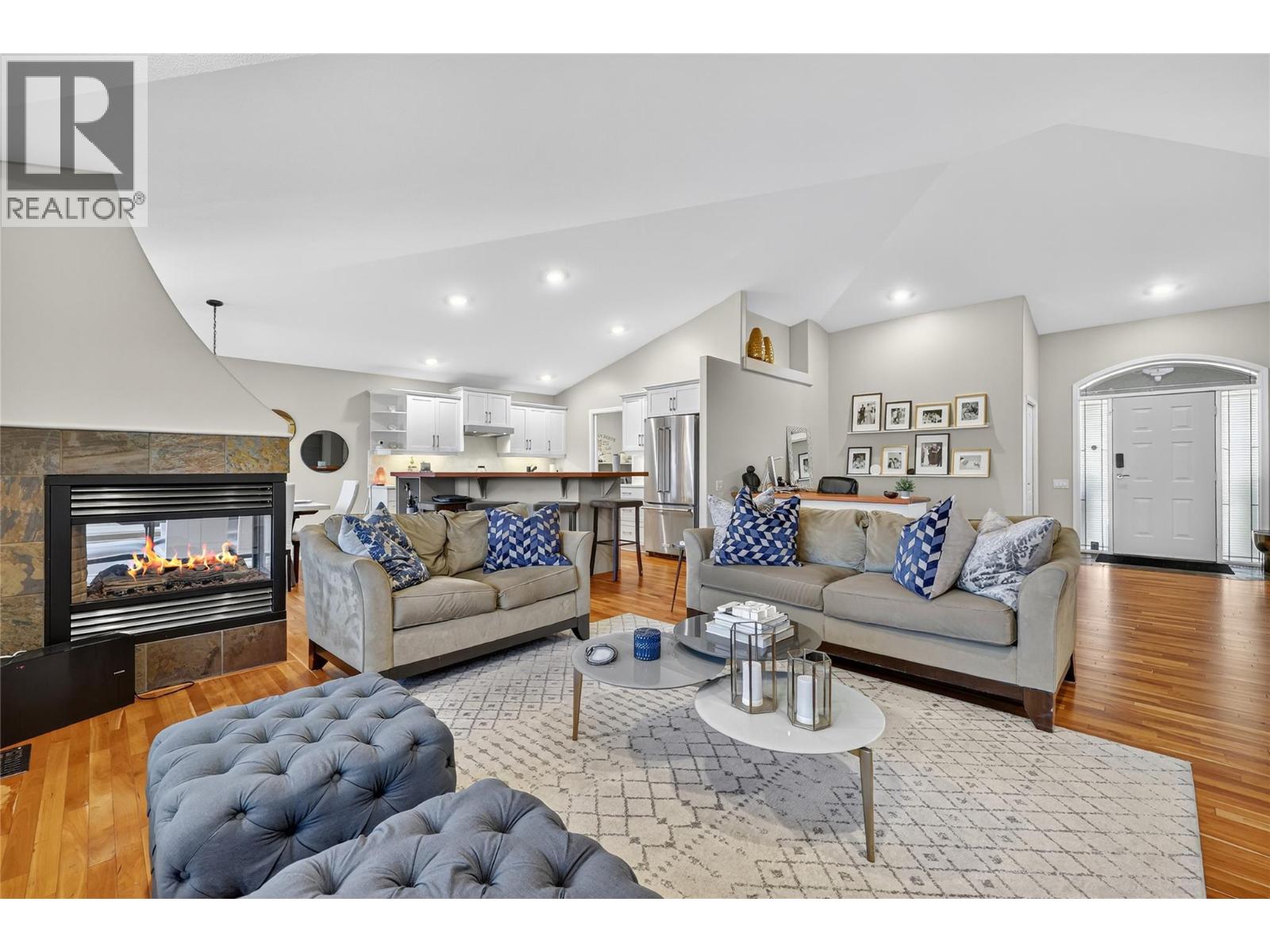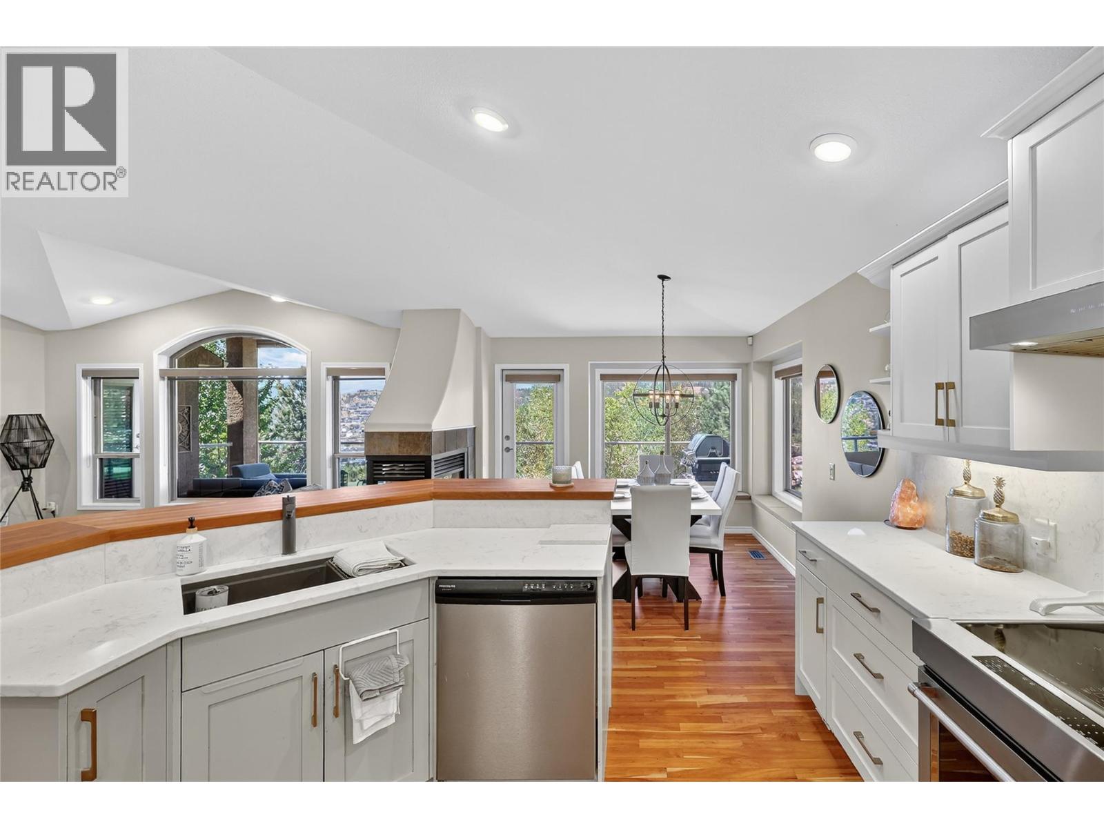 Absolutely stunning 3,200 sqft walk-out rancher on sought-after Dilworth Mountain, offering breathtaking 180° views of mountains, orchards, and Lake Okanagan. This stylish Dilworth Homes built home boasts a bright, flowing open plan with vaulted ceilings, large windows, and top-end finishes. The main level features 3 bedrooms, a 3 sided gas fireplaces, and a spacious kitchen with stainless steel appliances and quartz countertops. The lower level offers 2 additional bedrooms, a wet bar, a gas fireplace, and a huge rec room—perfect for entertaining. Enjoy the outdoors with a large covered patio with sunshade, a covered deck, and a private, zeroscaped backyard with a gas fire-pit. Double garage with oversized driveway and extra parking pad. Natural gas BBQ hookup. Close to Lake Okanagan, downtown Kelowna, beaches, golf, and shopping—this home delivers luxury, comfort, and location in one perfect package. (id:61840)
