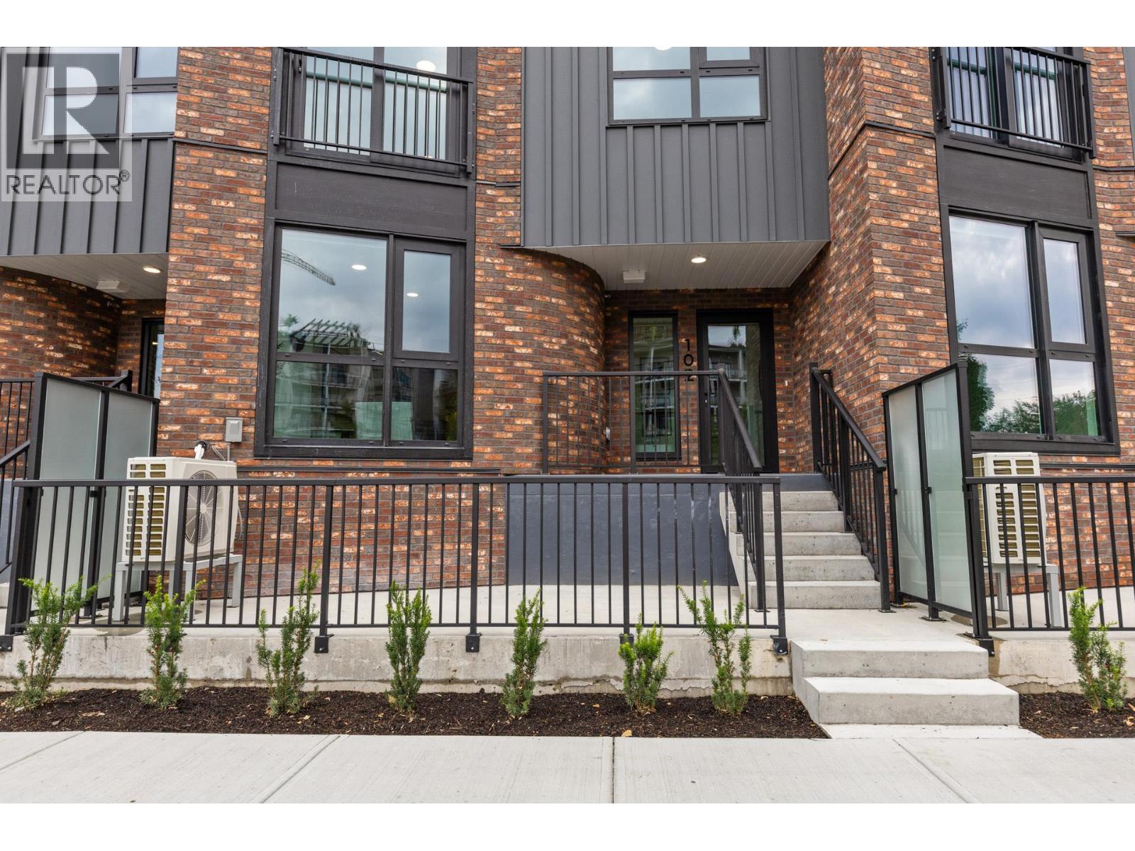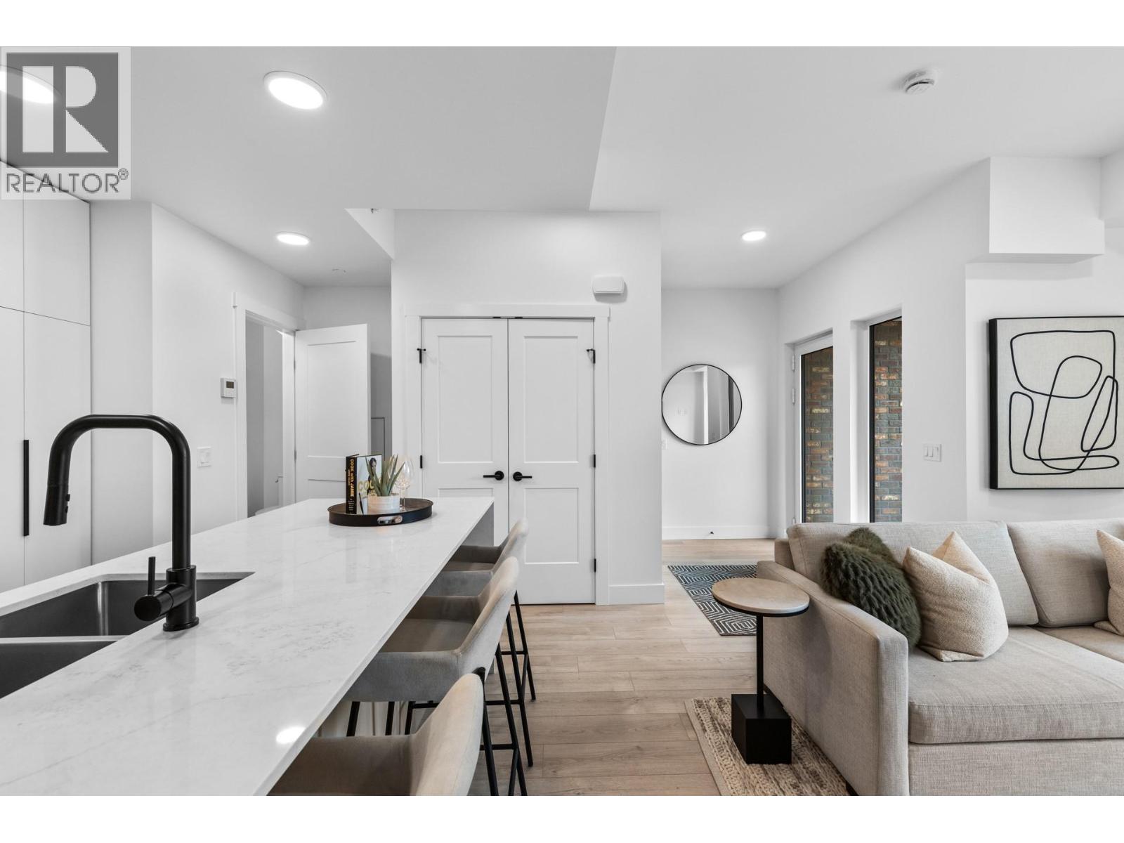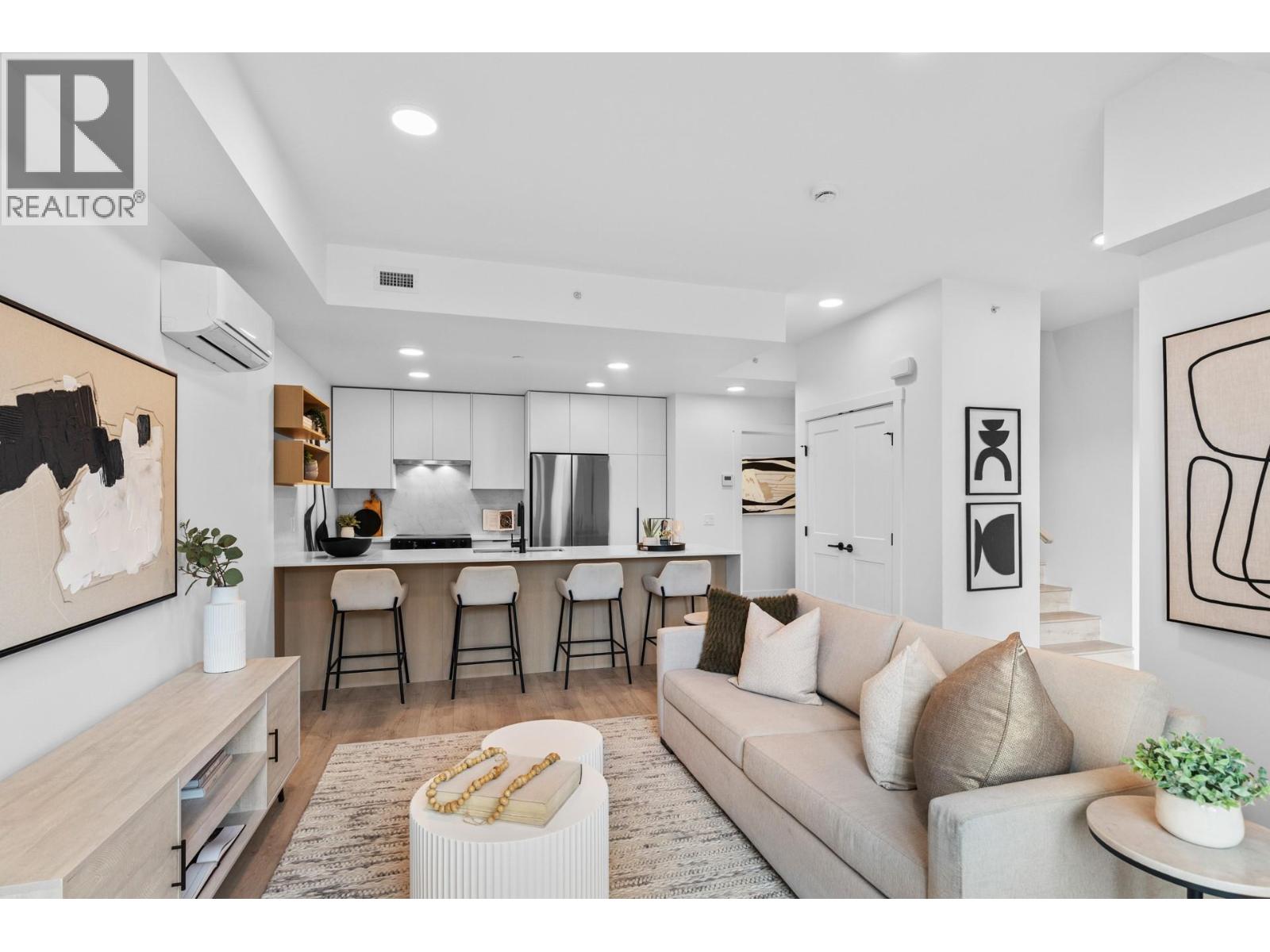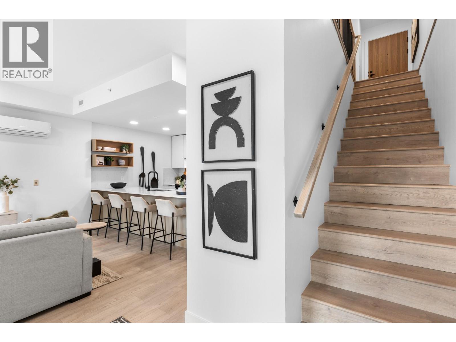 Brand new two storey townhouse style condo with street level entry, situated in downtown building Nolita. Enjoy the perks of condo living without sacrificing space. As you walk in from the quiet street, step into an open concept main floor features an upgraded quartz kitchen, full appliance package, and a light filled living/dining area, half bath on this floor as well. On the second floor, the spacious master suite includes a walk-in closet and its own fully tiled roomy walk-in shower, and double vanity. A second bedroom and a full bathroom along with the versatile den—ideal for home office, guest space, or hobby room. All the perks of downtown Kelowna are just outside your door: beaches, parks, craft breweries and restaurants. A New Home Warranty (2 5 10) ensures no surprise repair bills—just peace of mind. Strata fees cover nearly everything (you only pay your power & internet). Shared amenities include beautifully landscaped courtyard, gas BBQ lounge, fire table seating and an onsite dog park. It’s pet friendly with up to two pets of any size allowed. Smart building access includes secure entry, package management and elevator scheduling via the 1Valet app. Open house- walk ins welcome- Mon-Thur 11-7Pm and Fri-Sun 11-5PM (id:61840)