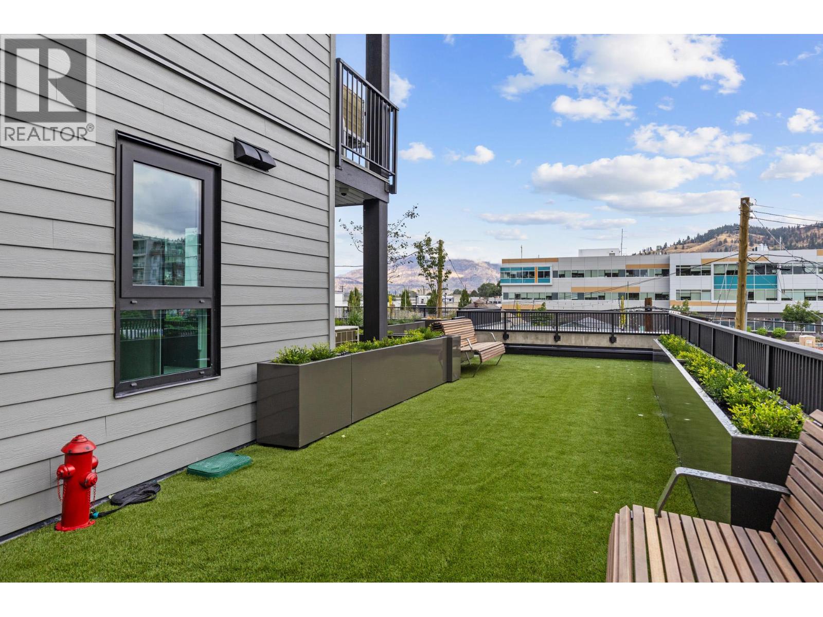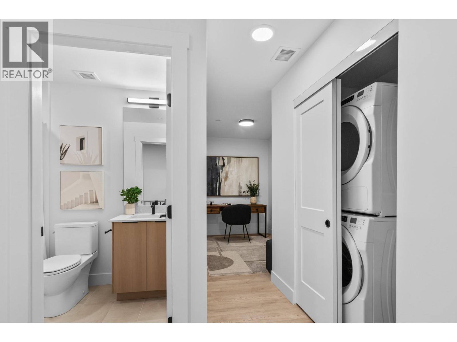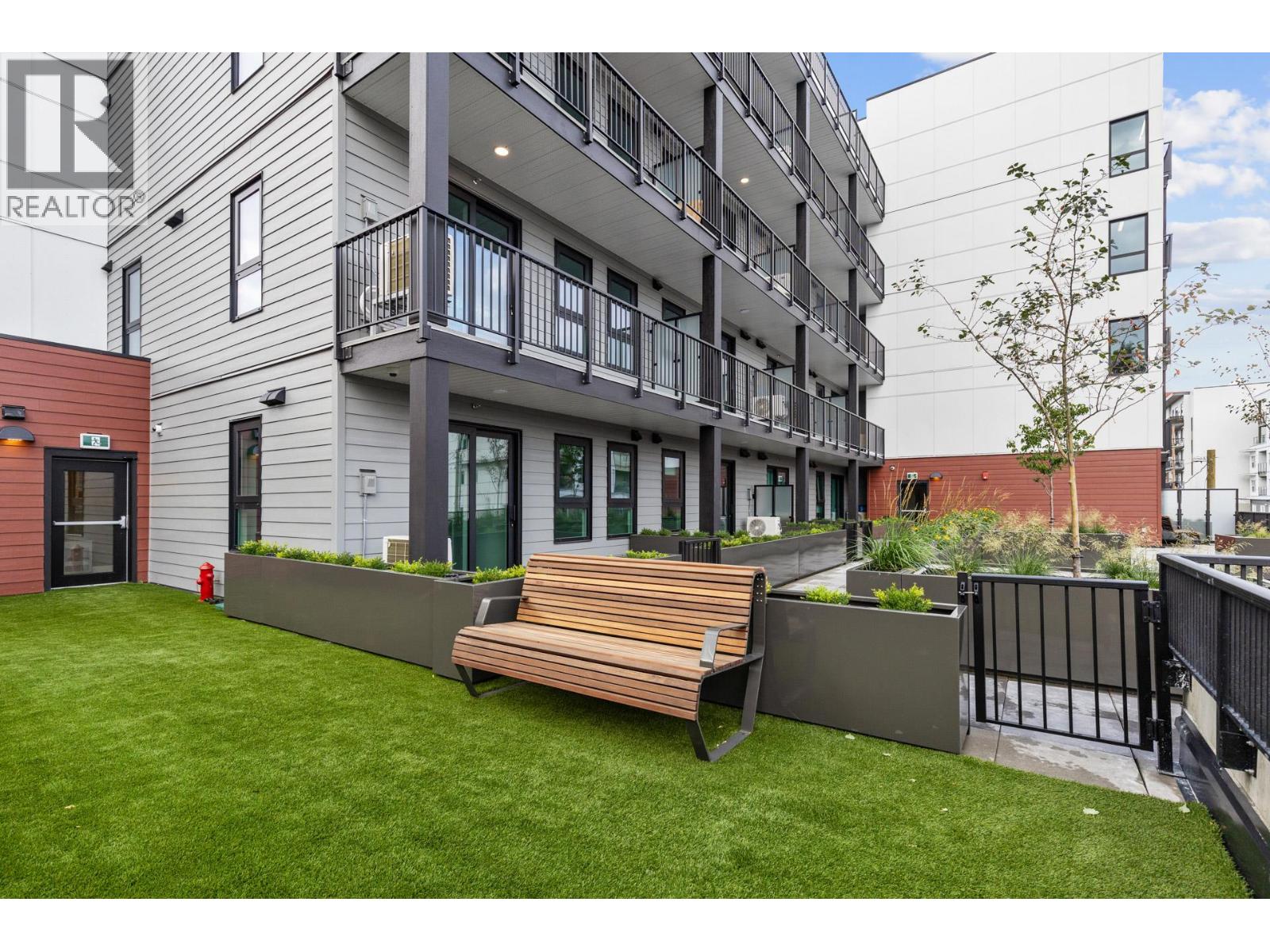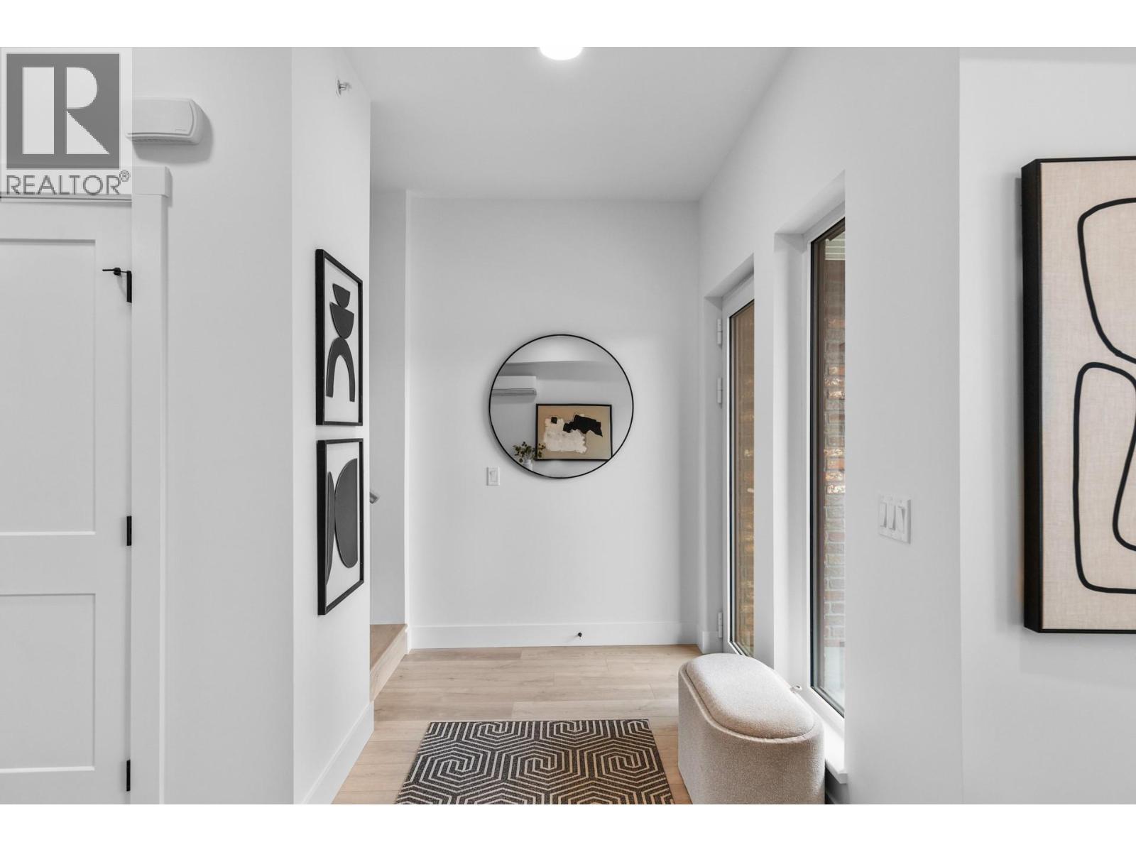 Brand new two storey townhouse style condo with street level entry, situated in downtown building Nolita. Enjoy the perks of condo living without sacrificing space. As you walk in from the quiet street, step into an open concept main floor features an upgraded quartz kitchen, full appliance package, and a light filled living/dining area, half bath on this floor as well. On the second floor, the spacious master suite includes a walk-in closet and its own fully tiled roomy walk-in shower, and double vanity. A second bedroom and a full bathroom along with the versatile den—ideal for home office, guest space, or hobby room. All the perks of downtown Kelowna are just outside your door: beaches, parks, craft breweries and restaurants. A New Home Warranty (2 5 10) ensures no surprise repair bills—just peace of mind. Strata fees cover nearly everything (you only pay your power & internet). Shared amenities include beautifully landscaped courtyard, gas BBQ lounge, fire table seating and an onsite dog park. It’s pet friendly with up to two pets of any size allowed. Smart building access includes secure entry, package management and elevator scheduling via the 1Valet app. Open house- walk ins welcome- Mon-Thur 11-7Pm and Fri-Sun 11-5PM (id:61840)