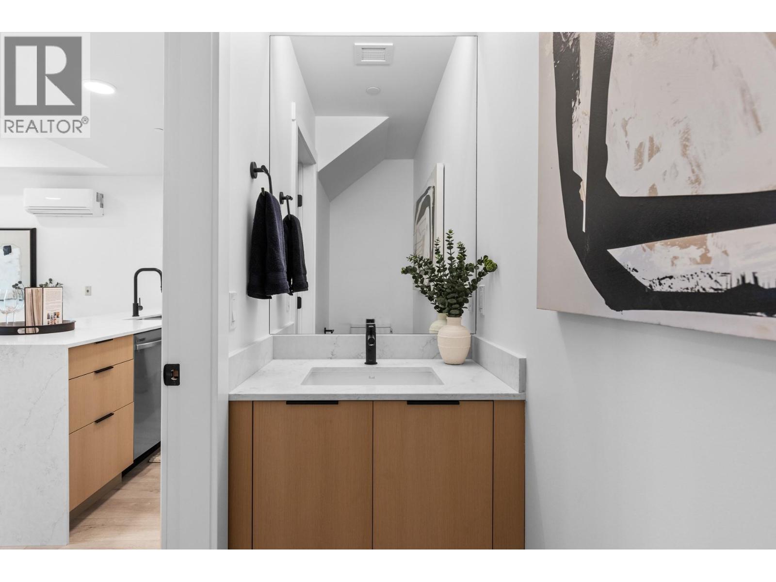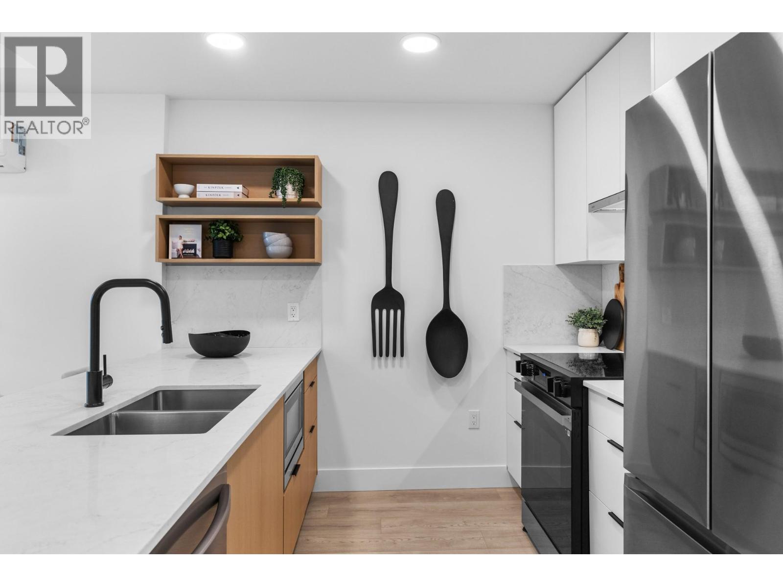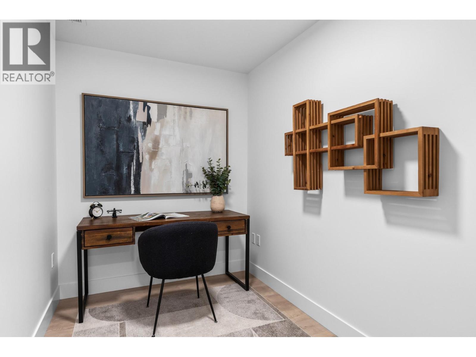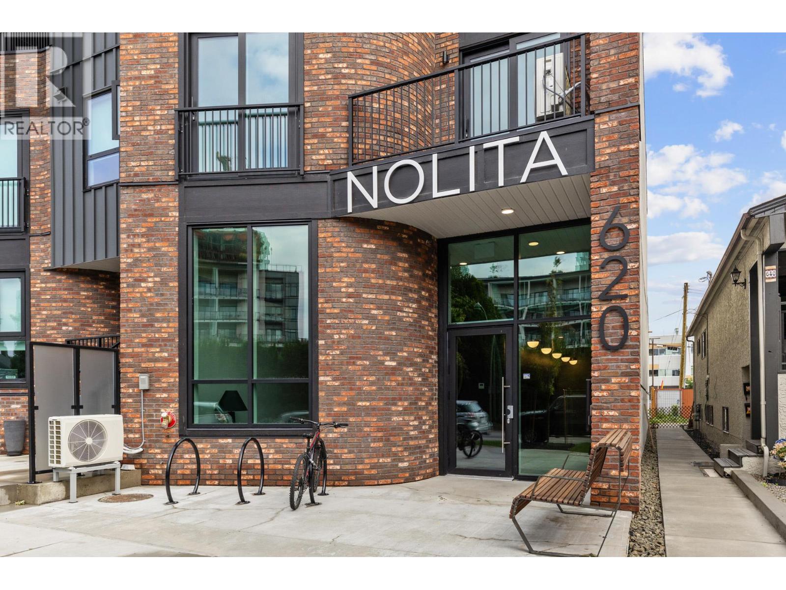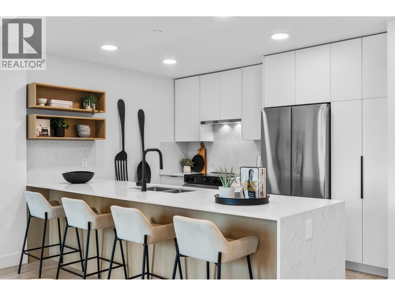 Brand new two storey townhouse style condo with street level entry, situated in downtown building Nolita. Enjoy the perks of condo living without sacrificing space. As you walk in from the quiet street, step into an open concept main floor features an upgraded quartz kitchen, full appliance package, and a light filled living/dining area, half bath on this floor as well. On the second floor, the spacious master suite includes a walk-in closet and its own fully tiled roomy walk-in shower, and double vanity. A second bedroom and a full bathroom along with the versatile den—ideal for home office, guest space, or hobby room. All the perks of downtown Kelowna are just outside your door: beaches, parks, craft breweries and restaurants. A New Home Warranty (2 5 10) ensures no surprise repair bills—just peace of mind. Strata fees cover nearly everything (you only pay your power & internet). Shared amenities include beautifully landscaped courtyard, gas BBQ lounge, fire table seating and an onsite dog park. It’s pet friendly with up to two pets of any size allowed. Smart building access includes secure entry, package management and elevator scheduling via the 1Valet app. Open house- walk ins welcome- Mon-Thur 11-7Pm and Fri-Sun 11-5PM (id:61840)